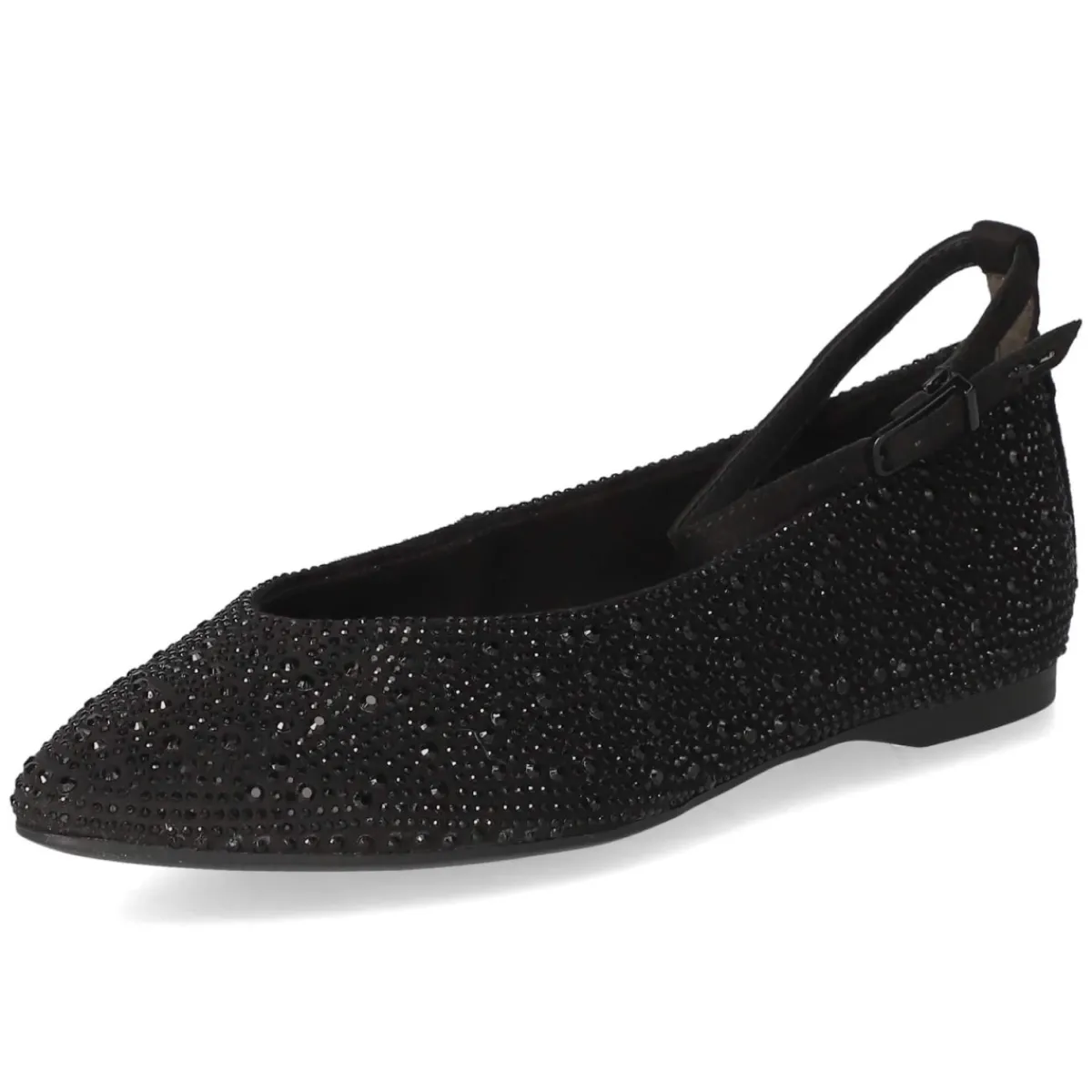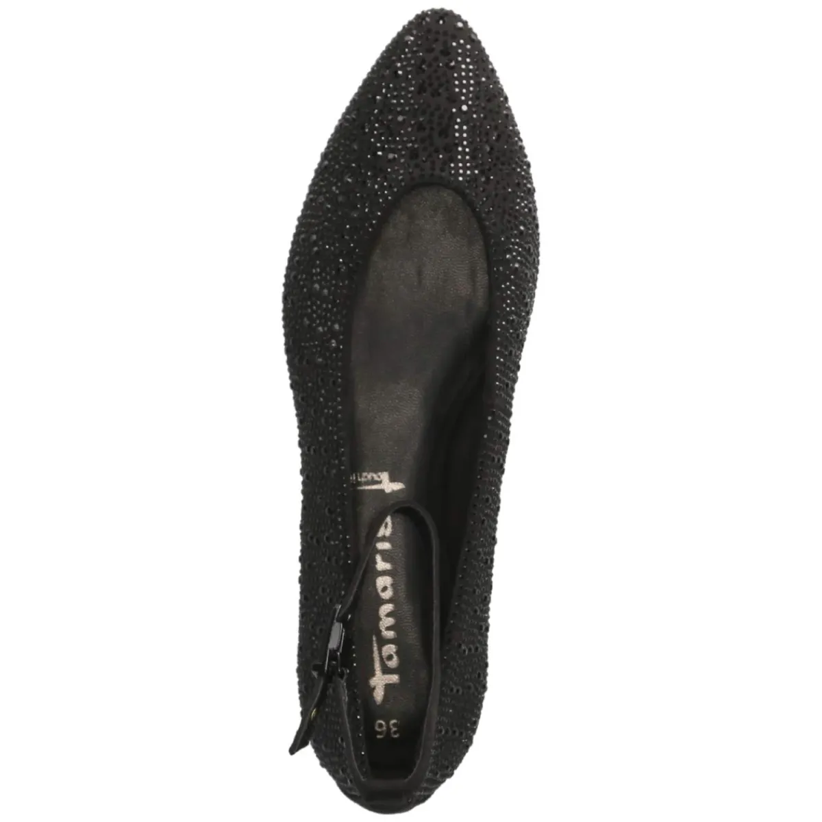 Diese schwarzen Tamaris Ballerinas verbinden festliches Design mit komfortabler Ausstattung. Die spitze Silhouette streckt optisch den Fuß, während die markante Zierschnalle mit schwarzen Schmucksteinen subtile Brillanz verleiht. Obermaterial aus Textil und eine Decksohle aus Textil & Synthetik sorgen für ein angenehmes Tragegefühl. Der klassische Magnetverschluss mit kleinem Elastikeinsatz erleichtert den Einstieg und hält sicher am Fuß. Ein weich gepolstertes Fußbett und die flexible, rutschfeste Laufsohle bieten verlässliche Bequemlichkeit – ideal für lange Abende. Das Modell fällt normal aus und eignet sich als elegante Alternative zu Pumps. Modetipp: Zu satiniertem Midirock und kurzem Blazer entsteht ein moderner Abendlook; alltagstauglich mit knöchellanger Zigarettenhose und feinem Strick top.