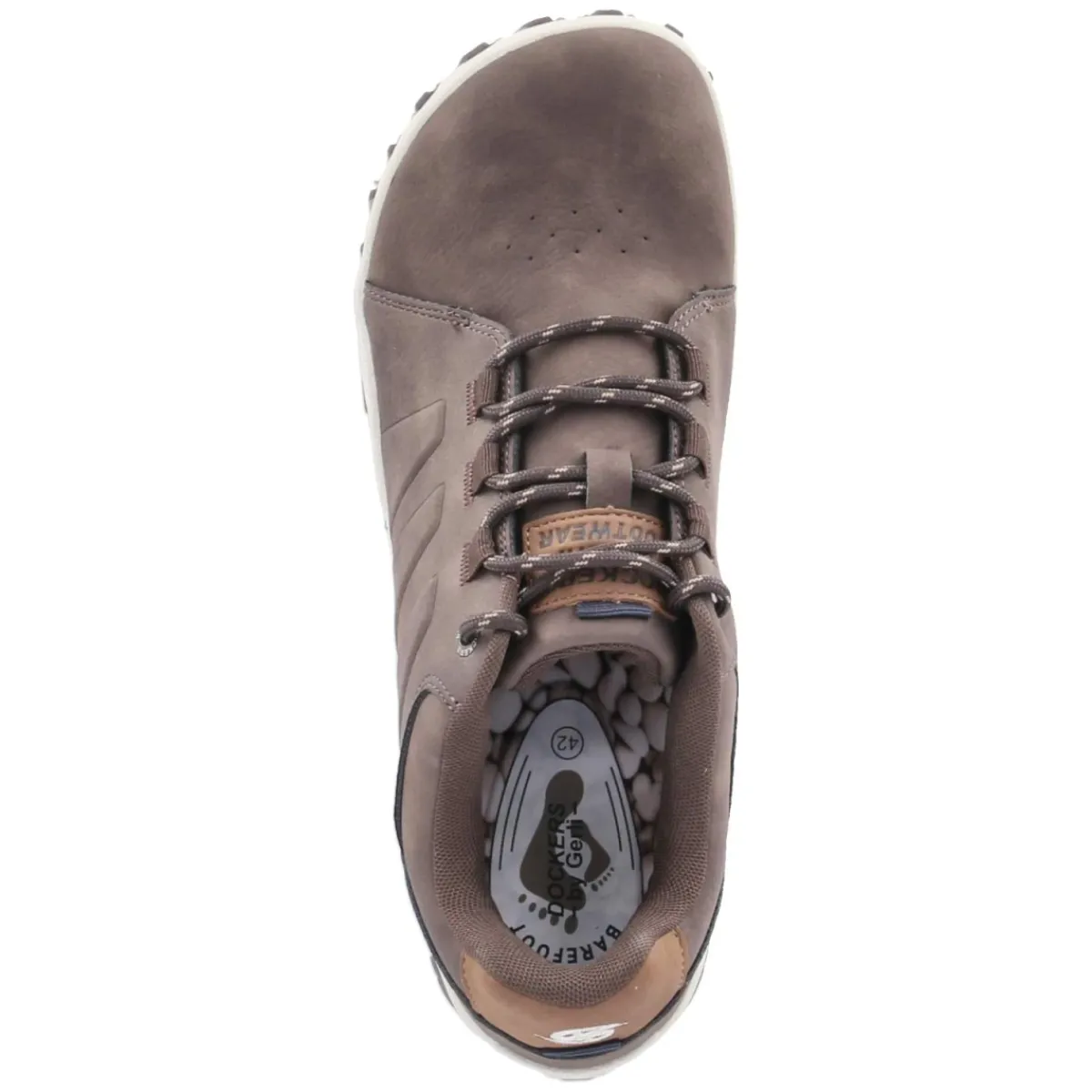 Der Dockers Barfußschuh für Herren verbindet natürliches Gehgefühl mit urbaner Lässigkeit. Die sehr flexible, rutschfeste Laufsohle unterstützt eine freie Abrollbewegung, während der verstärkte Fersenbereich Stabilität verleiht. Ein gepolsterter Einstieg und die runde Schuhspitze erhöhen den Komfort im Alltag. Das synthetische Obermaterial zeigt sich pflegeleicht und robust, die sportliche Seitenprägung setzt einen dezenten Akzent. Das komfortable Wechselfußbett lässt sich bei Bedarf gegen eigene Einlagen tauschen; die Decksohle aus Textil sorgt für ein angenehmes Klima. Mit klassischem Schnürverschluss lässt sich der braune Schuh präzise anpassen und fällt in der Größe normal aus. Modetipp: Zu einer schmalen Chino in Sand und einem leichten Strickpullover entsteht ein entspannter City-Look, der den minimalistischen Charakter des Barfußschuhs betont.