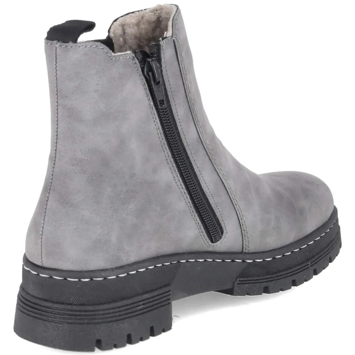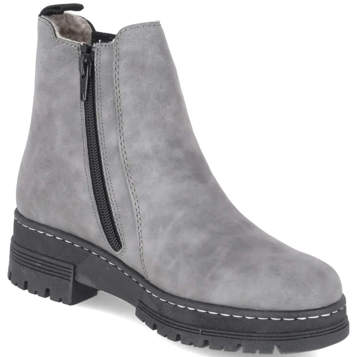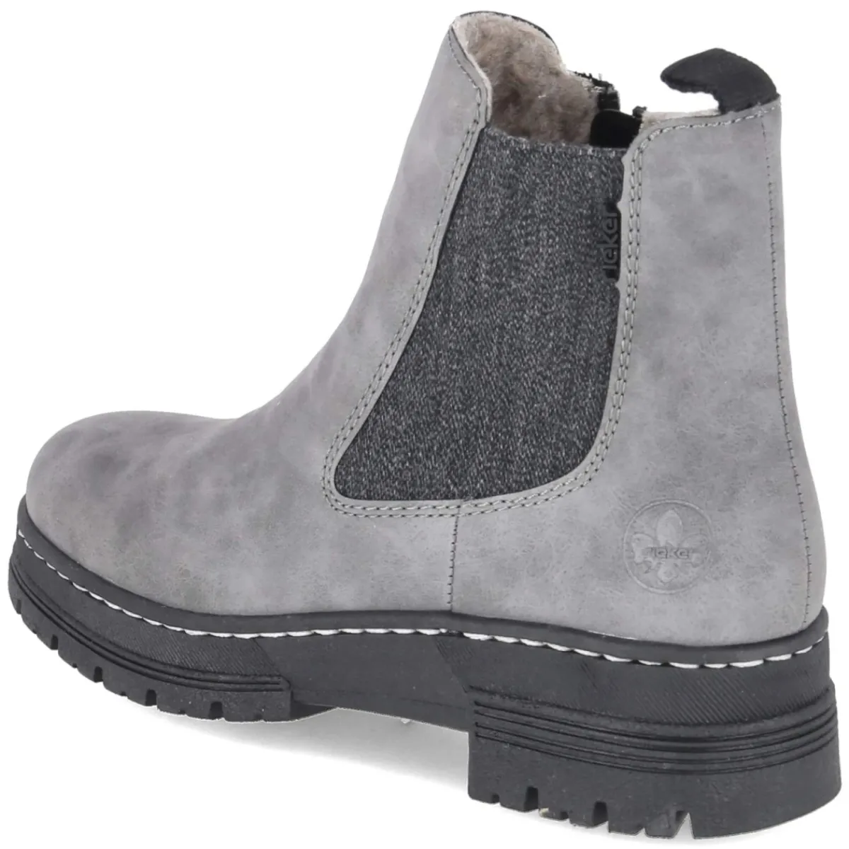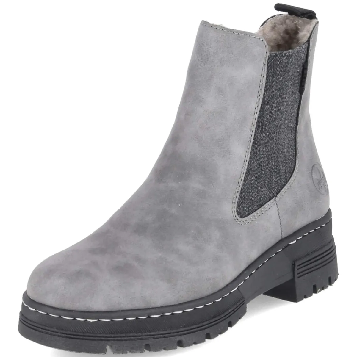 Diese grauen Chelsea Boots von Rieker verbinden wintertauglichen Komfort mit urbaner Leichtigkeit. Das pflegeleichte Obermaterial aus Synthetik schützt zuverlässig, während warmes Futter und die textile Decksohle für behagliche Temperaturen sorgen. Ein 4 cm hoher Blockabsatz bietet sicheren Stand, die runde Schuhspitze erhöht die Zehenfreiheit. Dank Reißverschluss, großer seitlicher Elastikeinsätze und Anziehlasche gelingt das Anziehen mühelos. Die flexible, rutschfeste Profilsohle hält souverän die Spur, das Wechselfußbett schafft Spielraum für individuelle Einlagen. Der Schuh fällt normal aus und bleibt als relaxtes Leichtgewicht auch an langen Tagen angenehm zu tragen. In zeitlosem Grau lässt sich das Modell vielseitig kombinieren – ob zum Casual-Look oder zum Büro-Outfit. Modetipp: Besonders stimmig wirkt der Boot zu dunkel gewaschener Slim-Jeans, Feinstrick-Rolli und einem wolligen Camelcoat.