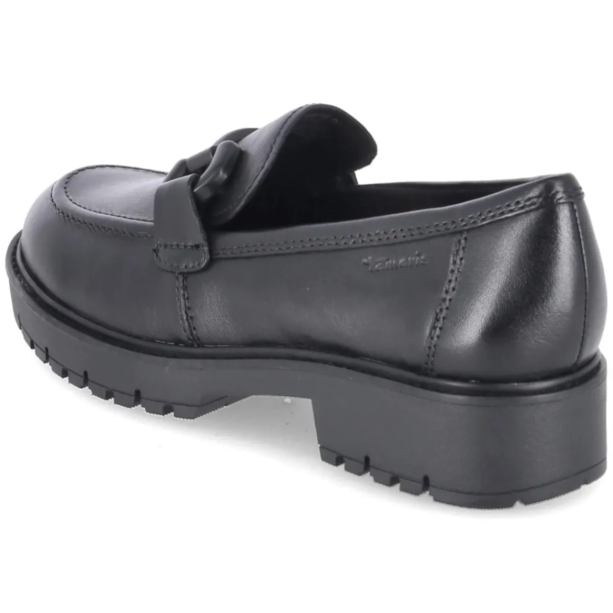Zeitloser Loafer von Tamaris in tiefem Schwarz verbindet klassisches Design mit modernem Komfort. Langlebiges Obermaterial aus hochwertigem Glattleder sorgt für eine edle Optik, die runde Spitze und die markante Zierkette über dem Spann setzen elegante Akzente. Der 4 cm hohe Blockabsatz bietet standfeste Höhe, während die flexible, rutschfeste Laufsohle sicheren Halt im Alltag liefert. Ein gepolstertes Fußbett und die synthetische Decksohle verwöhnen bei jedem Schritt, die verstärkte Ferse stabilisiert zusätzlich. Dank Schlupfform ohne Verschluss und normal ausfallender Passform entsteht ein unkompliziertes Trageerlebnis für erwachsene Trägerinnen. Markendetails unterstreichen die Wertigkeit und machen den Schuh zum vielseitigen Begleiter vom Office bis zum Dinner. Modetipp: Mit verkürzter Anzughose, Feinstricksocke und Oversize-Blazer entsteht ein souveräner Look, der Material und Kette stilvoll inszeniert.