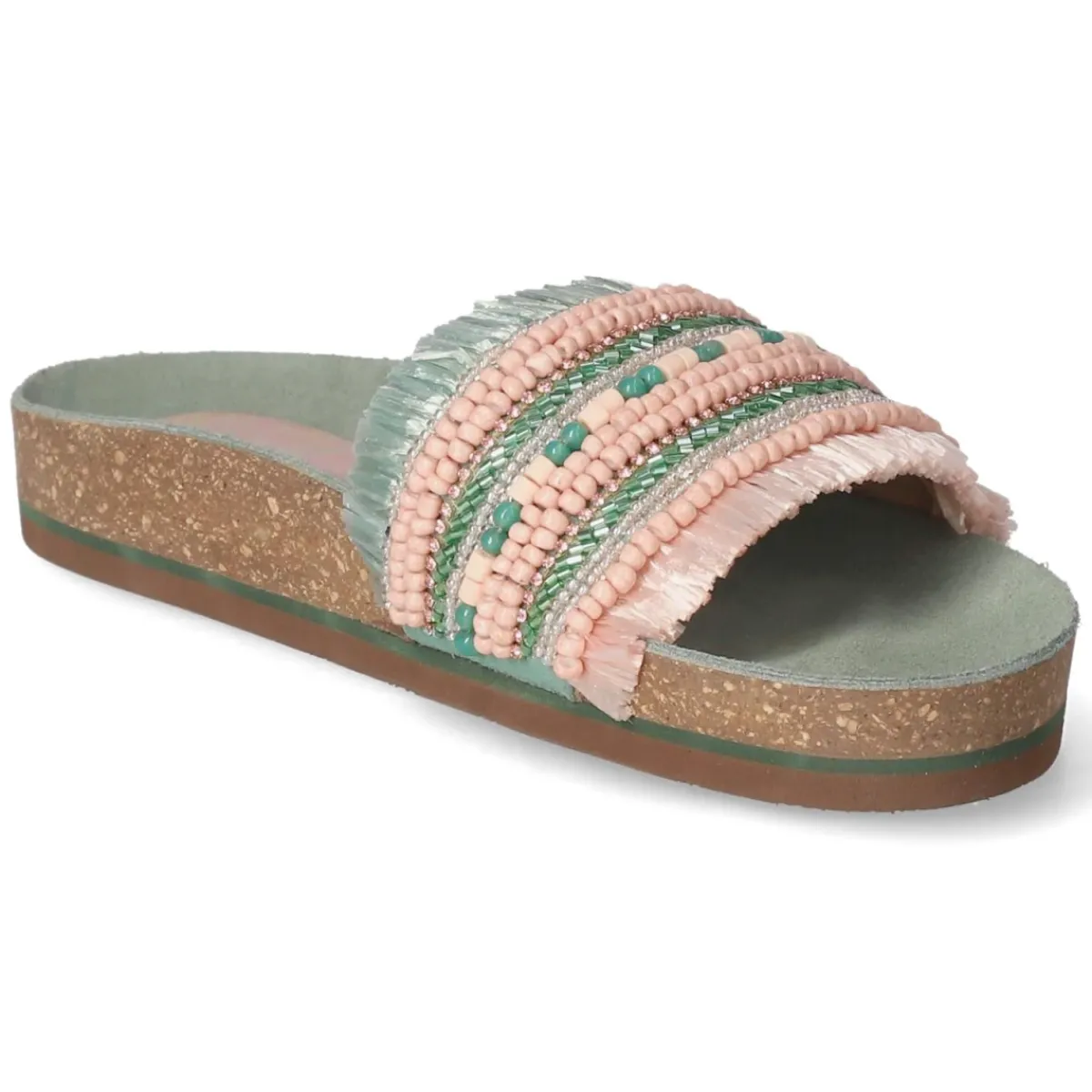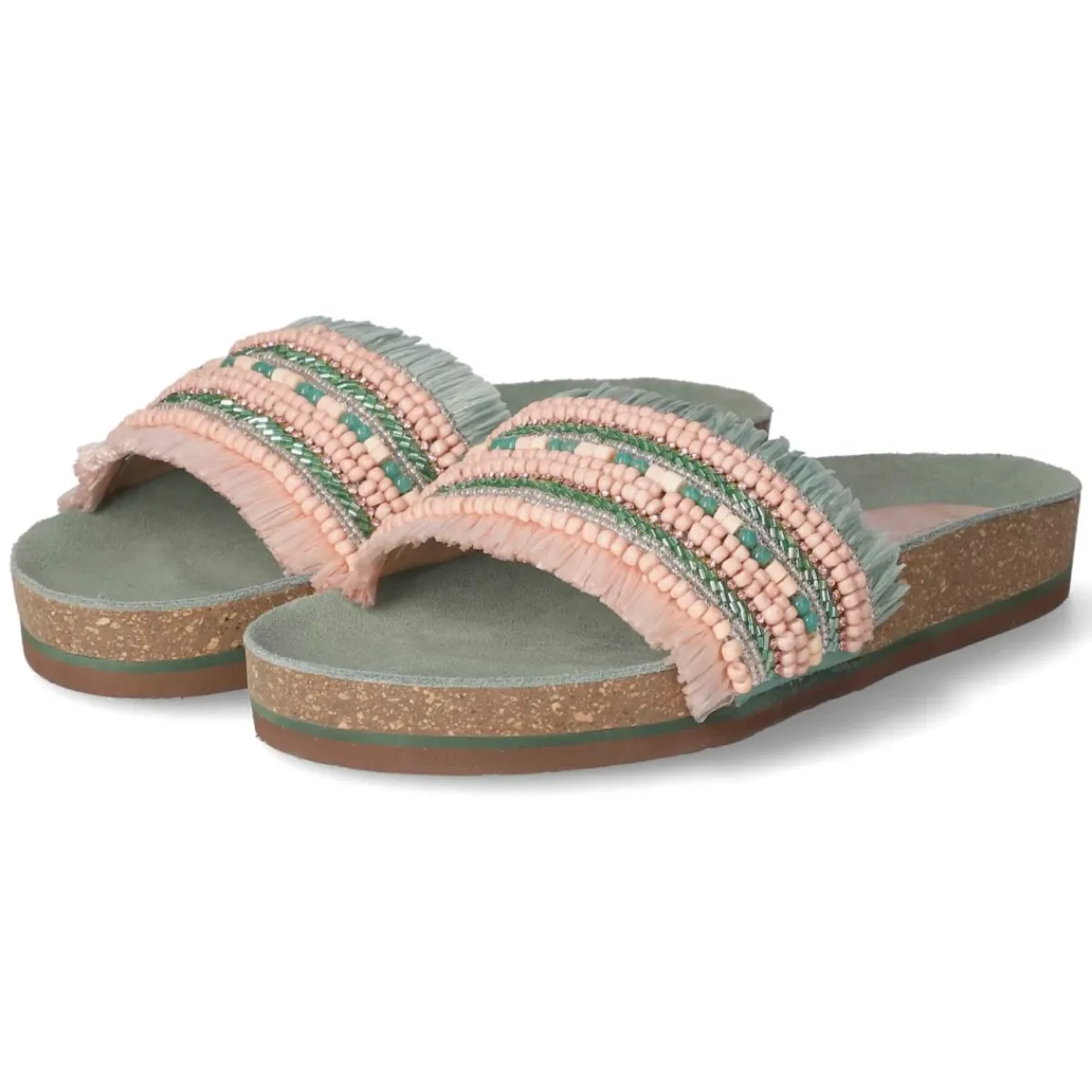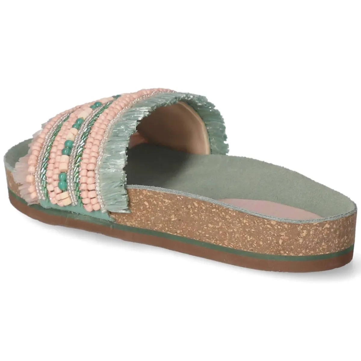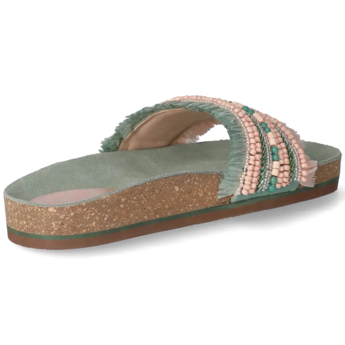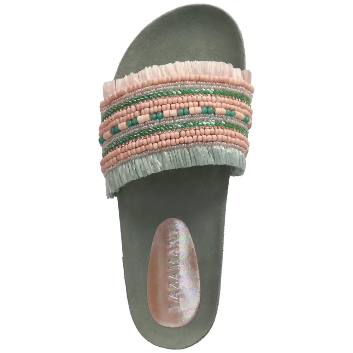 Sommerliches Statement in Grün: Die Pantoletten von LAZAMANI verbinden eine lässige Optik mit hochwertiger Verarbeitung. Das Obermaterial aus Textil zeigt grün-rosa Streifen, die durch unterschiedlich funkelnde Schmucksteine betont werden, während Fransendetails am Rand für eine entspannte Boho-Note sorgen. Eine echte Lederdecksohle und das weich gepolsterte Fußbett bieten angenehmen Komfort, die offene Schuhspitze lässt Luft an den Fuß. Dank ohne Verschluss gelingt das Hineinschlüpfen im Handumdrehen, die flexible, rutschhemmende Laufsohle sorgt für Halt auf verschiedensten Untergründen. Das Modell fällt normal aus und trägt sich vielseitig zu sommerlichen Looks. Modetipp: Für einen modernen Kontrast ein schlichtes Leinenkleid in Naturtönen kombinieren und dazu eine Basttasche wählen – so kommen Farben, Steine und Fransen besonders stilvoll zur Geltung.