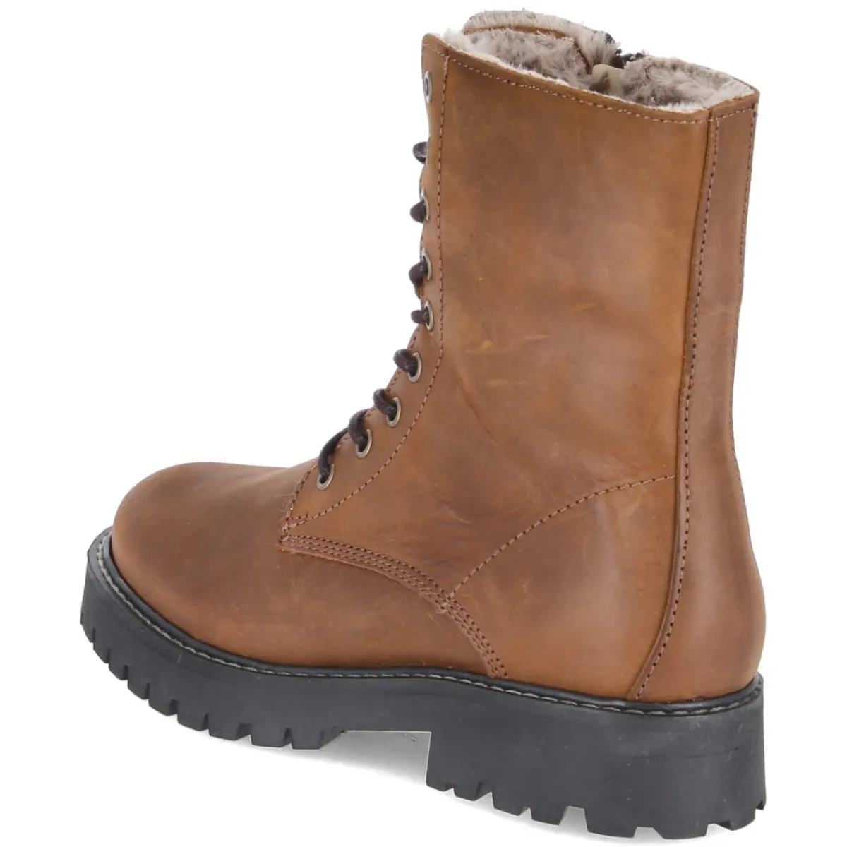 Fräulein Frida präsentiert mit diesen Damen-Schnürstiefeln in warmem Braun einen vielseitigen Begleiter für kalte Tage. Weiches Rauleder aus langlebigem Echtleder, eine rund zulaufende Spitze und der stabile 3,5-cm-Blockabsatz sorgen für einen souveränen Auftritt. Das Warmfutter und die textile Decksohle bieten behaglichen Komfort, während verstärkte Ferse und eine robuste, rutschfeste Profilsohle zuverlässigen Halt geben. Praktisch im Alltag: Schnürung für die perfekte Anpassung, seitlicher Reißverschluss für schnelles An- und Ausziehen. Ein Detail mit Charme ist die weiche Kunstfellkrempe an der oberen Schaftinnenseite. Der Größenhinweis fällt normal aus und erleichtert die Wahl. Die klare Formensprache eröffnet zahlreiche Kombinationsmöglichkeiten von casual bis chic. Modetipp: Besonders stimmig zu Strickkleid, Wollmantel und Ledertasche, ebenso gelungen zu Straight Jeans und oversize Cardigan.