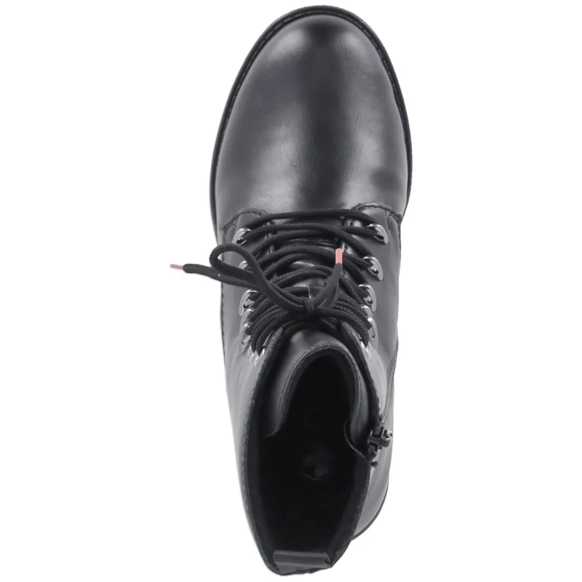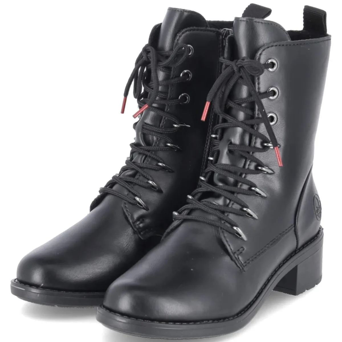 Schwarze Schnürstiefeletten von Rieker, die Komfort und Stil mühelos verbinden. Der 5 cm hohe Blockabsatz sorgt für standfeste Höhe, während die runde Schuhspitze und das gepolsterte Fußbett angenehmen Tragekomfort bieten. Das Obermaterial aus Synthetik überzeugt mit pflegeleichter Oberfläche, die flexible, rutschfeste Laufsohle und die verstärkte Ferse sichern Halt auf urbanen Wegen. Der bequeme Reißverschlusseinstieg wird durch die Schnürung ergänzt, so sitzt der Schaft (ca. 15 cm Höhe, 22 cm Umfang) angenehm am Fuß; die Anziehlasche erleichtert das Hineinschlüpfen. Leichtes Futter wärmt an kühlen Tagen, die Textil-Decksohle schmiegt sich weich an. Die Passform fällt normal aus und eignet sich ideal für Damen im Alltag. Modetipp: Zu Skinny-Jeans, grobem Strick und einem puristischen Wollmantel entsteht ein zeitloser City-Look.