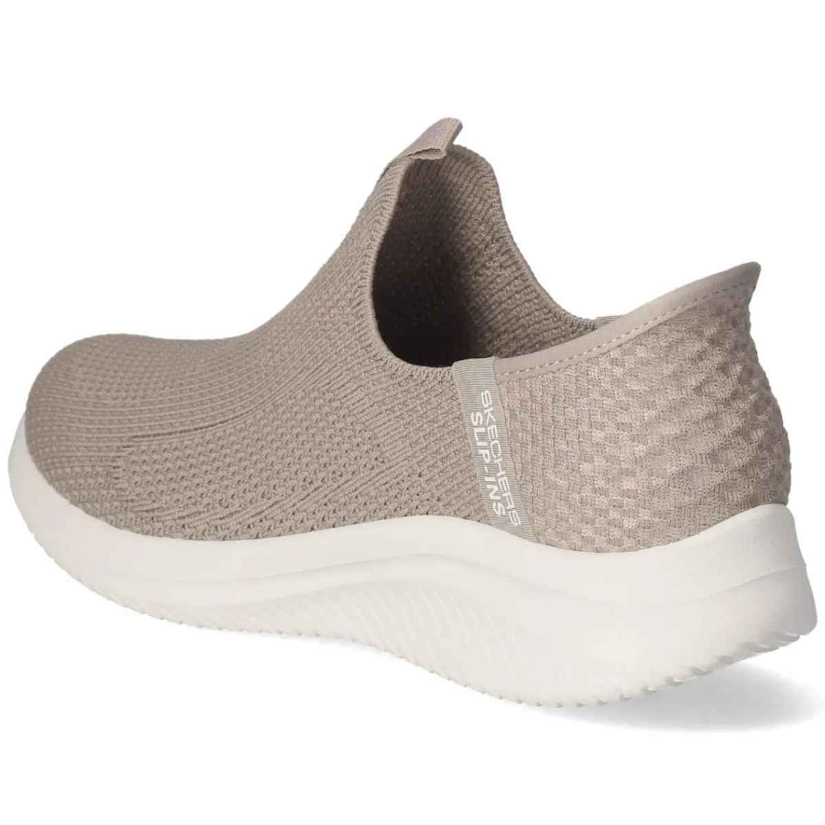 Der Slip Ins Sneaker EASY WIN von Skechers vereint Komfort und lässige Optik in einem vielseitigen Allrounder. Das taupefarbene Mesh-Textil schmiegt sich dank elastischem Einstieg angenehm an, die Anziehlasche erleichtert den unkomplizierten Einstieg und die runde Spitze bietet viel Zehenfreiheit. Eine weich gepolsterte Ferse sowie die textile Decksohle sorgen für angenehmes Tragegefühl, während die flexible, rutschhemmende Laufsohle zuverlässigen Halt im Alltag gibt. Der Sneaker fällt größengetreu aus, kommt ohne Verschluss aus und kann zur schnellen Auffrischung in der Waschmaschine gereinigt werden. Das Modell ist aus veganen Materialien gefertigt und zeigt ein zurückhaltendes Markendetail. Modetipp: Ton-in-Ton mit locker geschnittener Leinenhose und Feinstrick-Cardigan kombinieren, dazu feine Socken in Taupe für einen ruhigen, modernen Look.