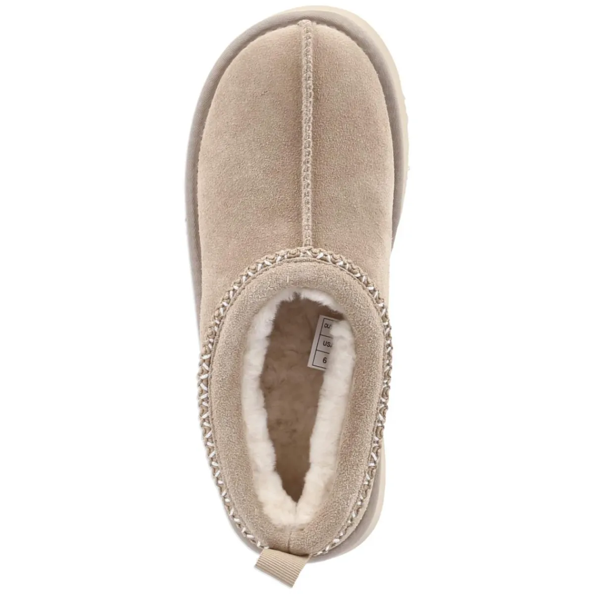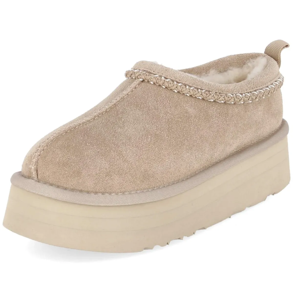 Der Slipper OUTBACK von Australia Luxe vereint lässige Gemütlichkeit mit markantem Auftritt. Robustes Rauleder aus echtem Leder in warmem Beige trifft auf eine 4,5 cm hohe Plateau-Sohle, die dezent streckt und angenehm dämpft. Das weiche Lammfellfutter sorgt für wohlige Wärme, während die textile Decksohle Komfort bietet. Der tiefe Einstieg mit grober Ziernaht unterstreicht das native Design, die Anziehlasche mit Markenstickerei erleichtert das Hineinschlüpfen – ganz ohne Verschluss. Mit runder Spitze und normaler Passform eignet sich der Slipper für den Alltag ebenso wie für urbane Winterlooks. Die stabile Verarbeitung verleiht Halt, das minimalistische Profil bleibt vielseitig kombinierbar. Modetipp: Besonders harmonisch zu weiten Strickhosen und einem voluminösen Mantel in Naturtönen oder als Kontrast zu Lederleggings und einem flauschigen Oversize-Pullover.