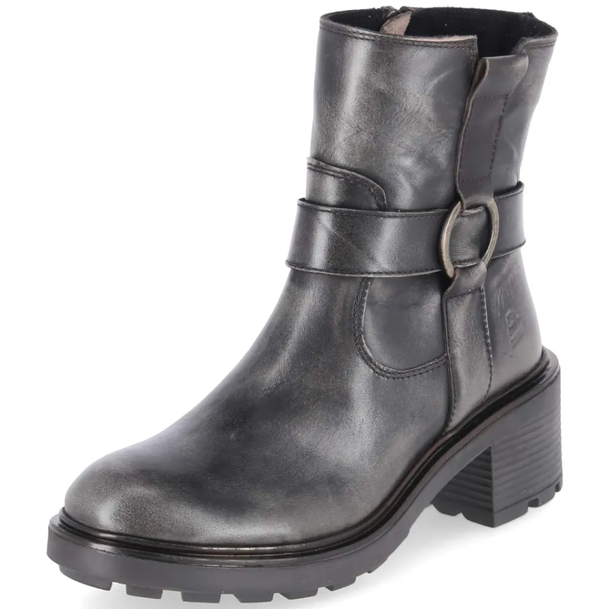 Bullboxer interpretiert den klassischen Biker-Look mit robusten Boots aus langlebigem Glattleder in Braun, das je nach Licht dezent grau wirken kann. Die markante Ringschnalle am Schaft betont die kraftvolle Silhouette, während die rutschfeste Profilsohle und der 6 cm hohe Blockabsatz sicheren Stand auf urbanem Terrain bieten. Ein gepolstertes Fußbett und eine synthetische Decksohle sorgen für Komfort im Alltag. Der schmale Schnitt und die runde Kappe verleihen dem Modell eine feminine Linie, der seitliche Reißverschluss ermöglicht einen bequemen Einstieg. Die solide Verarbeitung und die kräftige Sohle machen die Stiefelette zum beständigen Begleiter von Früh bis Spät. Modetipp: Für einen stilvollen Kontrast zu der derben Form eignen sich fließende Midikleider und Feinstrick, ergänzt um eine Lederjacke in Ton-in-Ton-Optik.