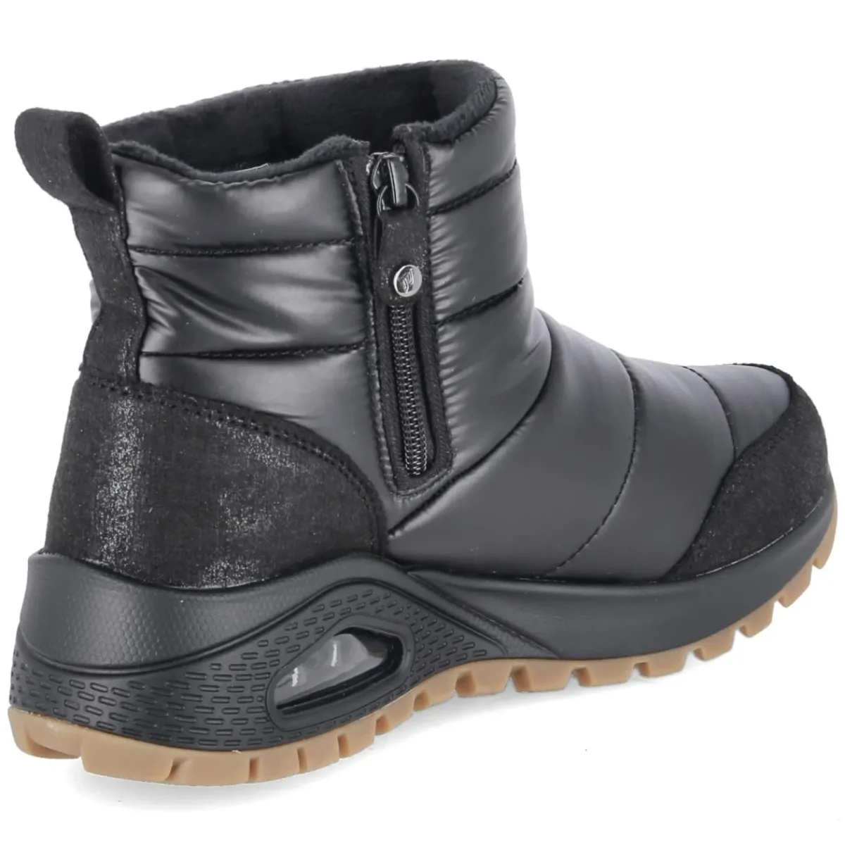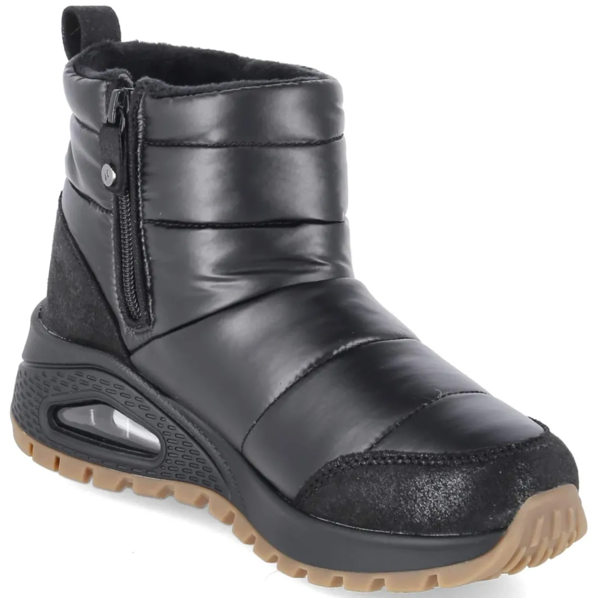 Die Skechers Boots UNO RUGGED PUFFER DAZE verbinden urbanen Look mit gemütlicher Wärme. Das schwarze Textil-Obermaterial zeigt eine markante Querstepp-Struktur, die von einem verstärkten Fersen- und Zehenbereich abgerundet wird. Innen sorgt ein weiches Warmfutter zusammen mit der legendären Memory-Foam-Fußbettung für behaglichen Tragekomfort, während der gepolsterte Einstieg und die runde Spitze ein angenehmes Laufgefühl unterstützen. Ein seitlicher Reißverschluss und die Anziehlasche erleichtern den Einstieg. Die flexible, rutschfeste Laufsohle mit Sichtfenster in der Ferse bietet zuverlässigen Grip auf winterlichen Wegen. Die pflegeleichte Oberfläche und der Größenhinweis „fällt normal aus“ machen den Alltag unkompliziert. Modetipp: Mit Steppmantel und gerader Cordhose entsteht ein toniger Look, den eine Beanie in Wolloptik stilvoll komplettiert.
