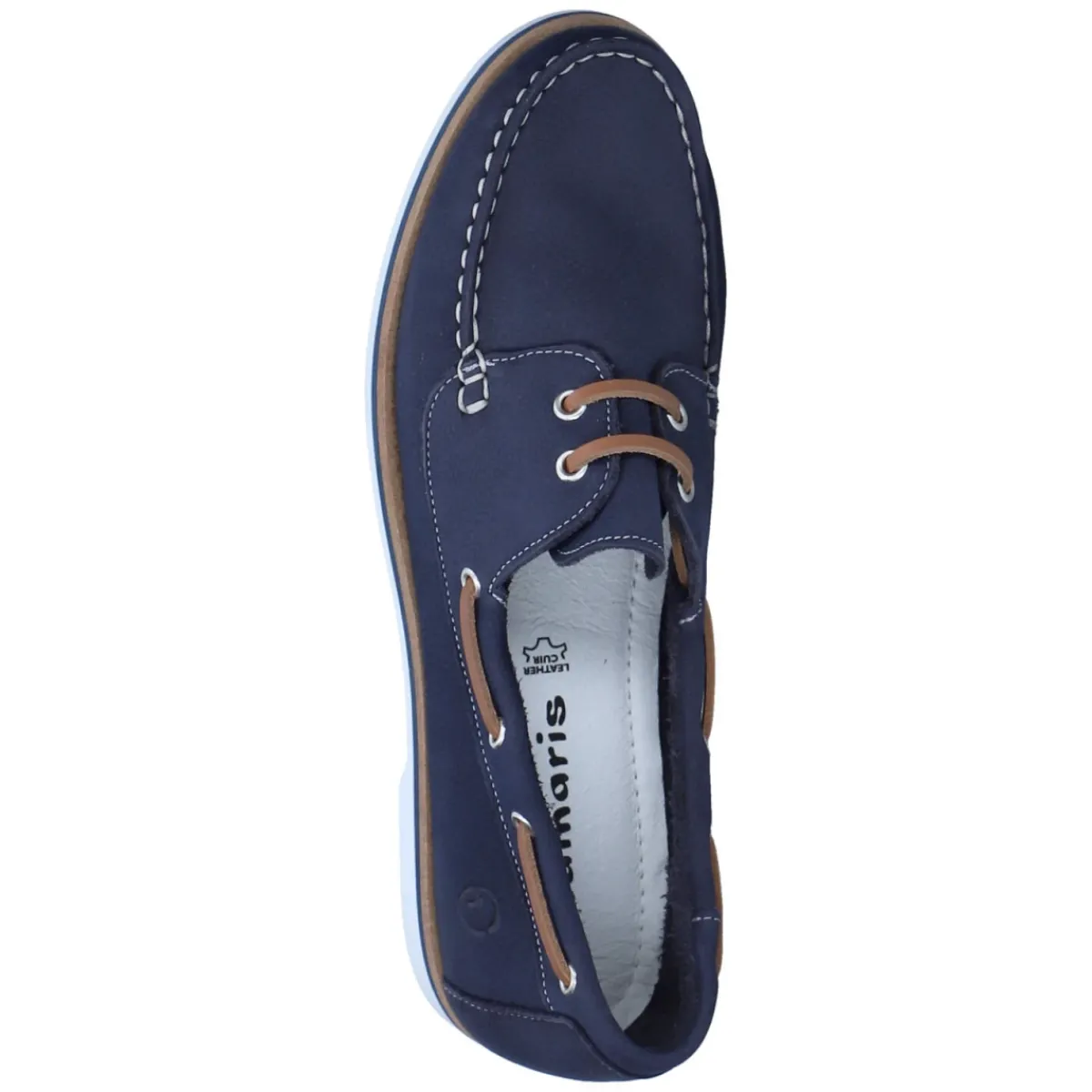 Dieser Damen-Bootsschuh von Tamaris setzt auf maritimen Charme und zeitlosen Komfort. Weiches Rauleder in sattem Blau umschließt den Fuß, die markante Wulstnaht und rustikale Ziernähte betonen den klassischen Look. Eine runde Spitze und die fein justierbare Schnürung sorgen für einen entspannten Sitz, während die verstärkte Ferse Stabilität verleiht. Innen überzeugen Lederfutter und eine lederne Decksohle, darunter bietet das gepolsterte Wechselfußbett angenehme Dämpfung über den Tag. Die flexible, rutschhemmende Laufsohle gibt sicheren Halt auf glatten Böden. Der Schuh fällt normal aus und begleitet Erwachsene stilvoll im Alltag und auf Reisen. Modetipp: Zu Cropped-Jeans, gestreiftem Bretonshirt und leichter Trenchjacke entsteht ein lässiger City-Marine-Look, der auch am Wochenende punktet.