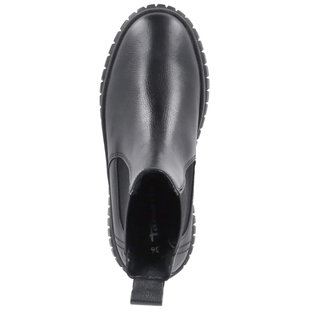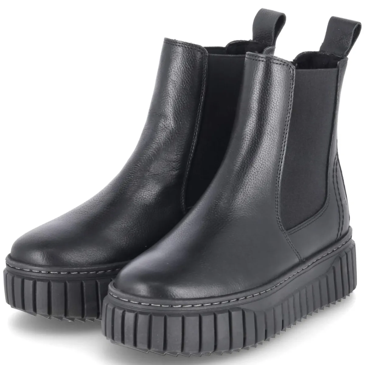 Die Chelsea Boots von Tamaris verbinden ikonisches Design mit alltagstauglichem Komfort. Das schwarze Glattleder aus langlebigem Echtleder präsentiert sich mit elegant matter Oberfläche und einer runden Schuhspitze, die dem Fuß genügend Raum lässt. Elastikeinsätze und Anziehlasche erleichtern den Einstieg, während der 4 cm hohe Plateauabsatz subtil Höhe schenkt und den Look modern abrundet. Ein leichtes Futter wärmt an kühlen Tagen, das gepolsterte Fußbett entlastet bei langen Wegen. Für sicheren Tritt sorgt die rutschfeste Laufsohle, ergänzt um einen verstärkten Fersenbereich für Formstabilität. Die Decksohle aus Textil erhöht den Tragekomfort auch bei empfindlichen Füßen. Ein vielseitiger Begleiter für erwachsene Damen, der zu City-Styles ebenso passt wie zum Office. Modetipp: Zur schmalen Anzughose und einem Oversize-Blazer tragen, dazu ein Ledergürtel in Schwarz für einen cleanen, urbanen Monochrom-Look.