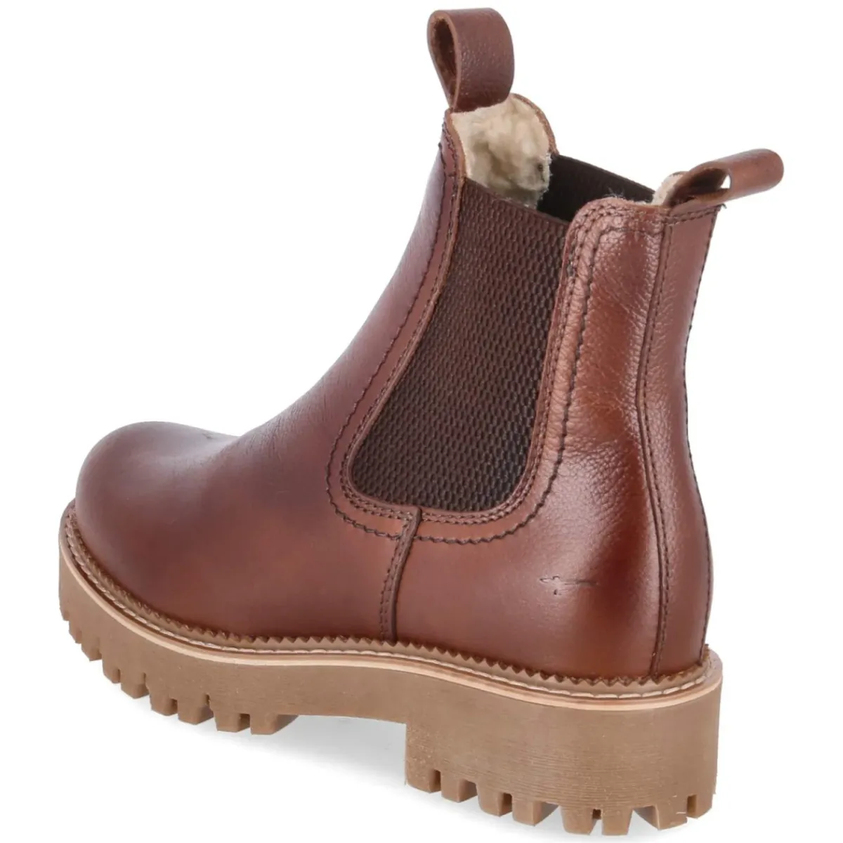 Tamaris präsentiert einen klassischen Chelsea Boot für Damen, der zeitlose Eleganz mit durchdachtem Komfort verbindet. Das braune Glattleder aus robustem Echtleder zeigt eine edle Maserung und wird von zwei großen, seitlichen Elastikeinsätzen eingerahmt, die den charakteristischen Look unterstreichen und den Einstieg erleichtern. Zwei praktische Anziehlaschen und der Verzicht auf einen Verschluss betonen die unkomplizierte Handhabung. Innen sorgt ein warmes Futter gemeinsam mit einem gepolsterten Fußbett und textilem Decksohlenmaterial für behagliches Tragegefühl an kalten Tagen. Die runde Schuhspitze und der 4 cm hohe Blockabsatz bieten alltagstaugliche Proportionen, während die rutschfeste Profilsohle verlässlichen Grip liefert. Der Leisten fällt normal aus und passt Erwachsenenfüßen komfortabel. Modetipp: Braun harmoniert hervorragend mit cremefarbenem Strick, gerader Denim und kamelfarbenem Wollmantel setzen den Boot stilvoll in Szene.