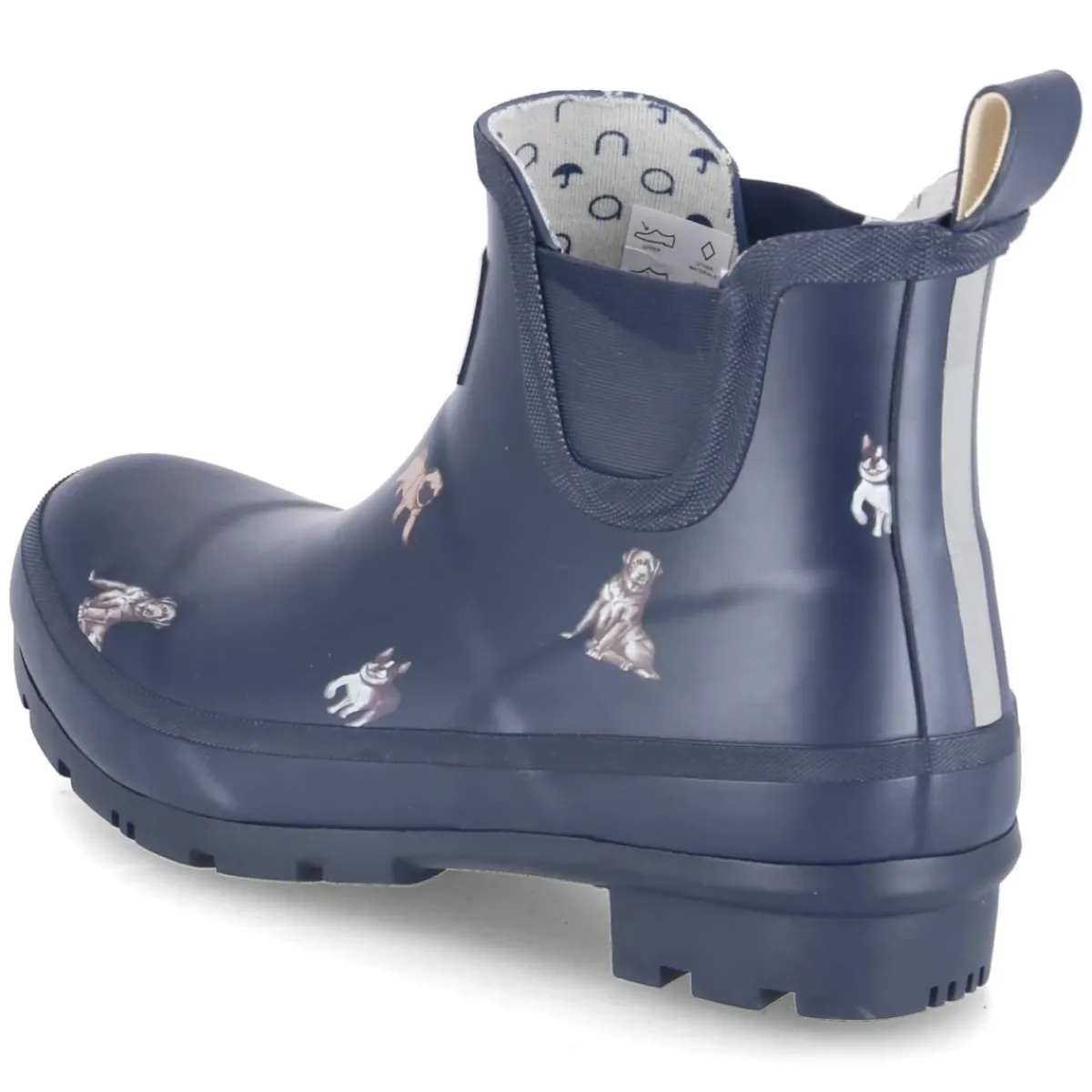 Der Chelsea Boot DOG von Rajn verbindet urbanen Charme mit praktischer Alltagstauglichkeit. Das blaue, bedruckte Gummi-Obermaterial mit markantem Hundeprint ist wasserabweisend und unkompliziert zu pflegen, während seitliche Elastikeinsätze und Anziehlasche einen mühelosen Einstieg ermöglichen. Die runde Schuhspitze, ein 3-cm-Blockabsatz und das modern designte Synthetik-Finish treffen auf ein gepolstertes, herausnehmbares Wechselfußbett und eine textile Decksohle für angenehmen Tragekomfort. Ein verstärkter Fußrahmen stabilisiert, die Ferse mit Reflektorstreifen und reflektierende Details erhöhen die Sichtbarkeit. Die flexible, rutschhemmende Profilsohle sorgt für Grip bei nassem Untergrund. Der Damenschuh fällt normal aus und ergänzt mühelos zeitgemäße Looks. Modetipp: Mit dunkler Straight-Jeans, gestreifter Stricksocke und kurzem Trench entsteht ein lässig-eleganter City-Style.