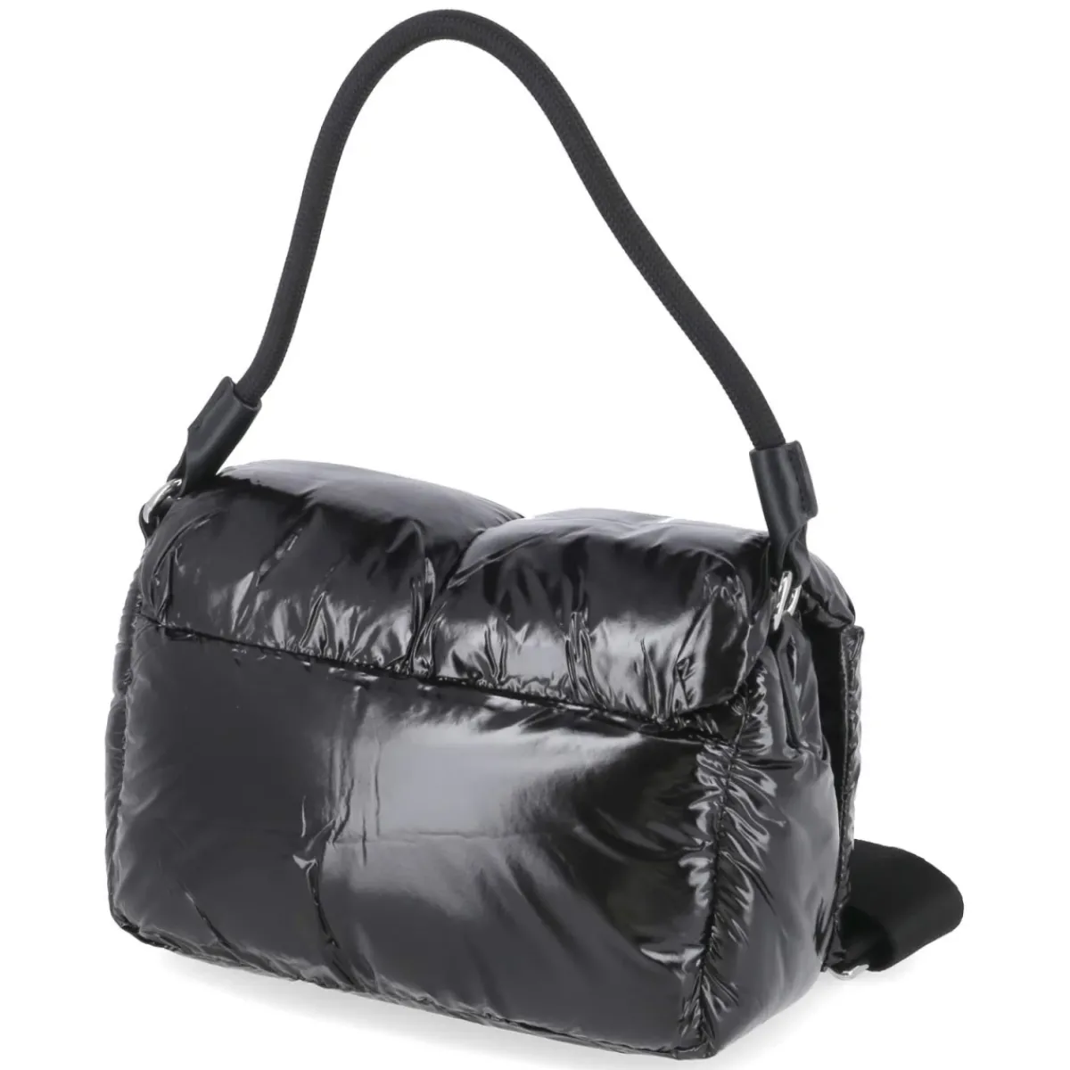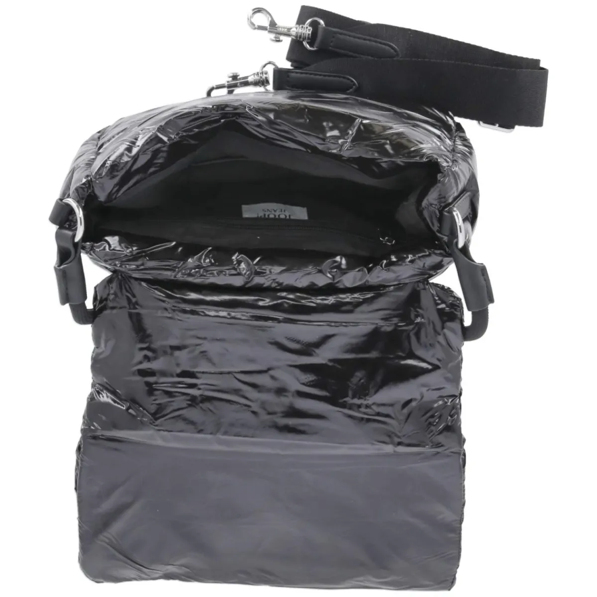 Die Flap Bag VARSITY ZORA in Schwarz setzt mit puff-gestepptem Lackdesign und markantem Frontlogo ein klares Statement. Die kompakte Silhouette (ca. 15 x 25 x 10 cm) fasst rund 3 Liter und bietet mit einem Reißverschlussfach sowie einem Steckfach strukturierte Übersicht für Essentials. Der magnetische Überschlag schließt sicher und lässt zugleich schnellen Zugriff zu. Flexible Tragemöglichkeiten ergeben sich aus dem festen Schulterriemen von ca. 40 cm und dem zusätzlich verstellbaren Gurt bis ca. 130 cm, so wird aus der eleganten Schultertasche im Handumdrehen eine komfortable Crossbody-Begleitung. Glänzende Oberfläche, weiches Volumen und klare Linien verbinden Mode und Funktion in einem vielseitigen Accessoire für Damen. Modetipp: Im monochromen Look mit schwarzem Blazer, Wide-Leg-Hose und metallischen Akzenten wirkt die Tasche besonders modern.