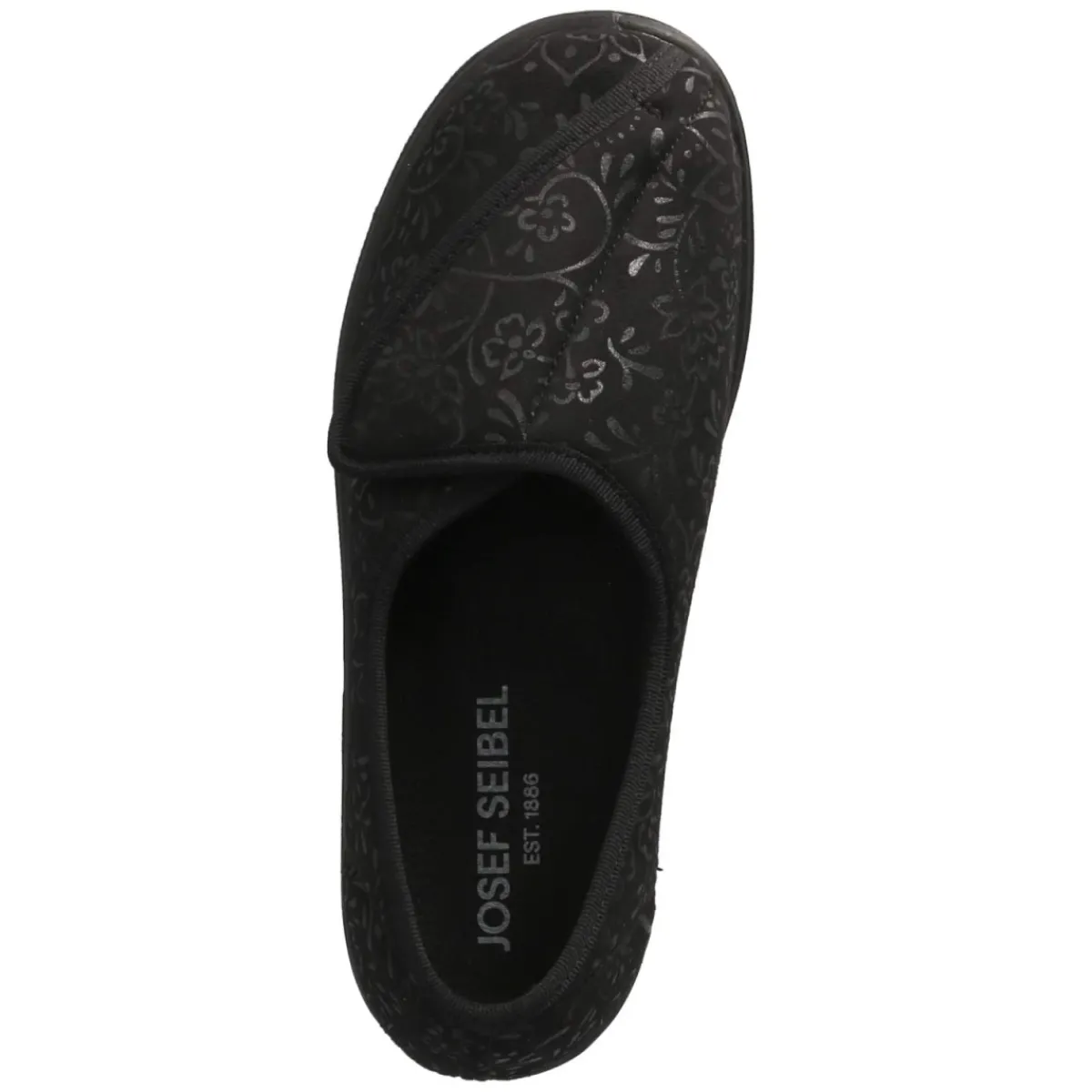 Die Hausschuhe NICE 104 von Josef Seibel verbinden behaglichen Komfort mit dezentem Stil. Das leichte Textilobermaterial in Schwarz schmiegt sich angenehm an und wird von einem schimmernden floralen Muster elegant akzentuiert. Dank rund gearbeiteter Schuhspitze und gepolsterter Decksohle entsteht ein weiches Auftrittsgefühl, das selbst lange Abende auf den Beinen entspannt. Das angenehme Textilfutter sorgt für ein ausgeglichenes Klima, während die flexible Laufsohle leise und anpassungsfähig bleibt. Der bequeme Klettverschluss ermöglicht eine schnelle, individuell regulierbare Passform, die durch die verstärkte Ferse stabil geführt wird. Das Modell fällt normal aus und bietet zuverlässigen Halt im Alltag daheim. Modetipp: Zu einem feinen Strickset in Anthrazit und weichen Kuschelsocken in Ton-in-Ton wirkt das dezente Schwarz besonders edel.