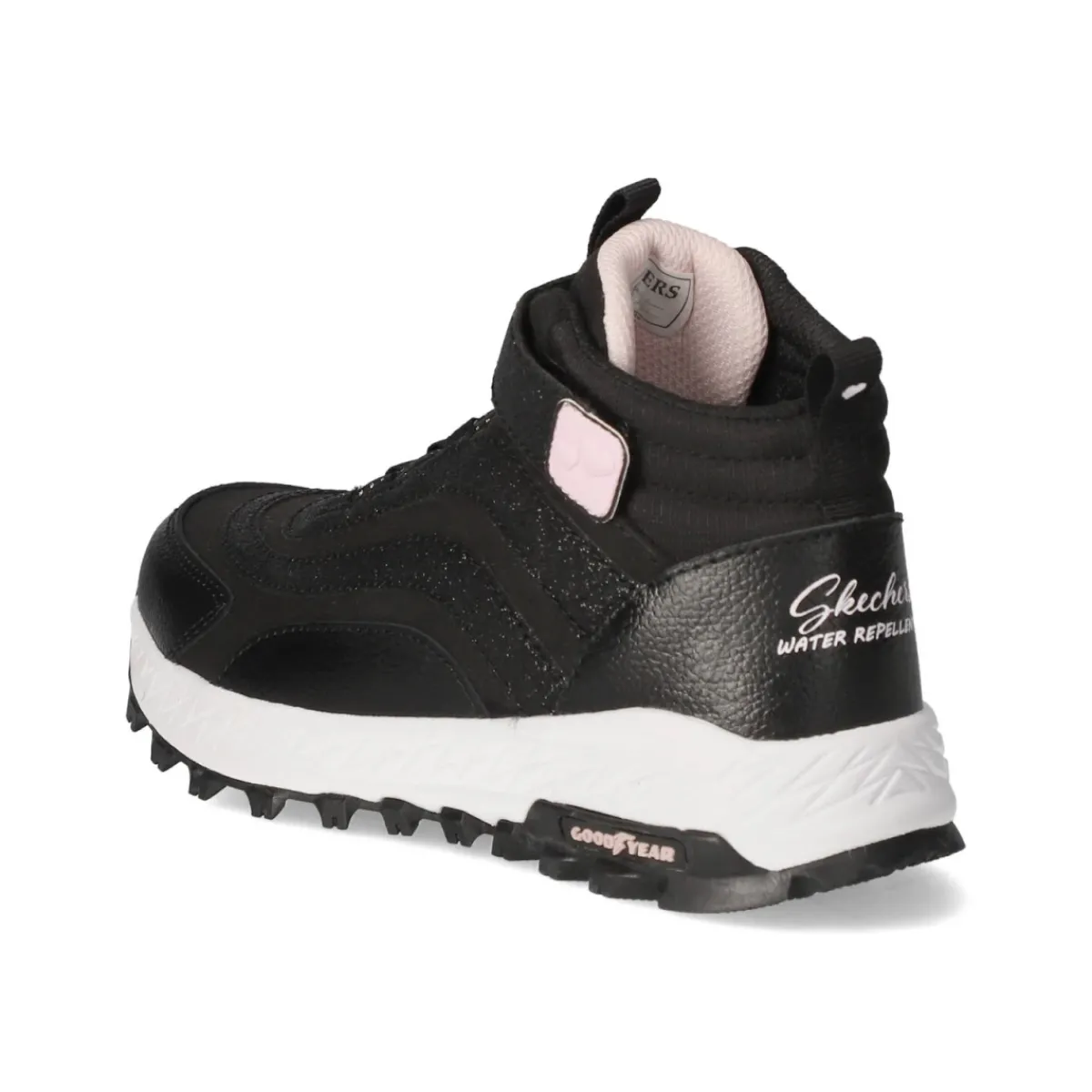 Der High Sneaker WILD ADVENTURE von Skechers vereint wetterfesten Schutz mit sportlichem Look. Das robuste Obermaterial aus Leder und Textil hält dank wasserfestem Finish und wasserabweisender Ausrüstung Regenschauer zuverlässig ab. Elastikschnürung und Klettverschluss erleichtern das Anziehen, die Anziehlasche unterstützt zusätzlich. Der gepolsterte Einstieg und die weich gepolsterte Textildecksohle sorgen für angenehmen Komfort, während verstärkter Zehen- und Fersenbereich den Schuh besonders kindgerecht und langlebig machen. Die flexible, profilierte Laufsohle bietet guten Grip auf nassem Asphalt wie auf dem Spielplatz. In Schwarz mit glitzernden Highlights und runder Kappe passt das sportliche Design zu vielen Outfits, der Fit fällt normal aus. Modetipp: Mit wetterfester Softshelljacke, Cargo-Jogger und reflektierender Mütze entsteht ein cooler Outdoor-Look für Schule und Abenteuer.