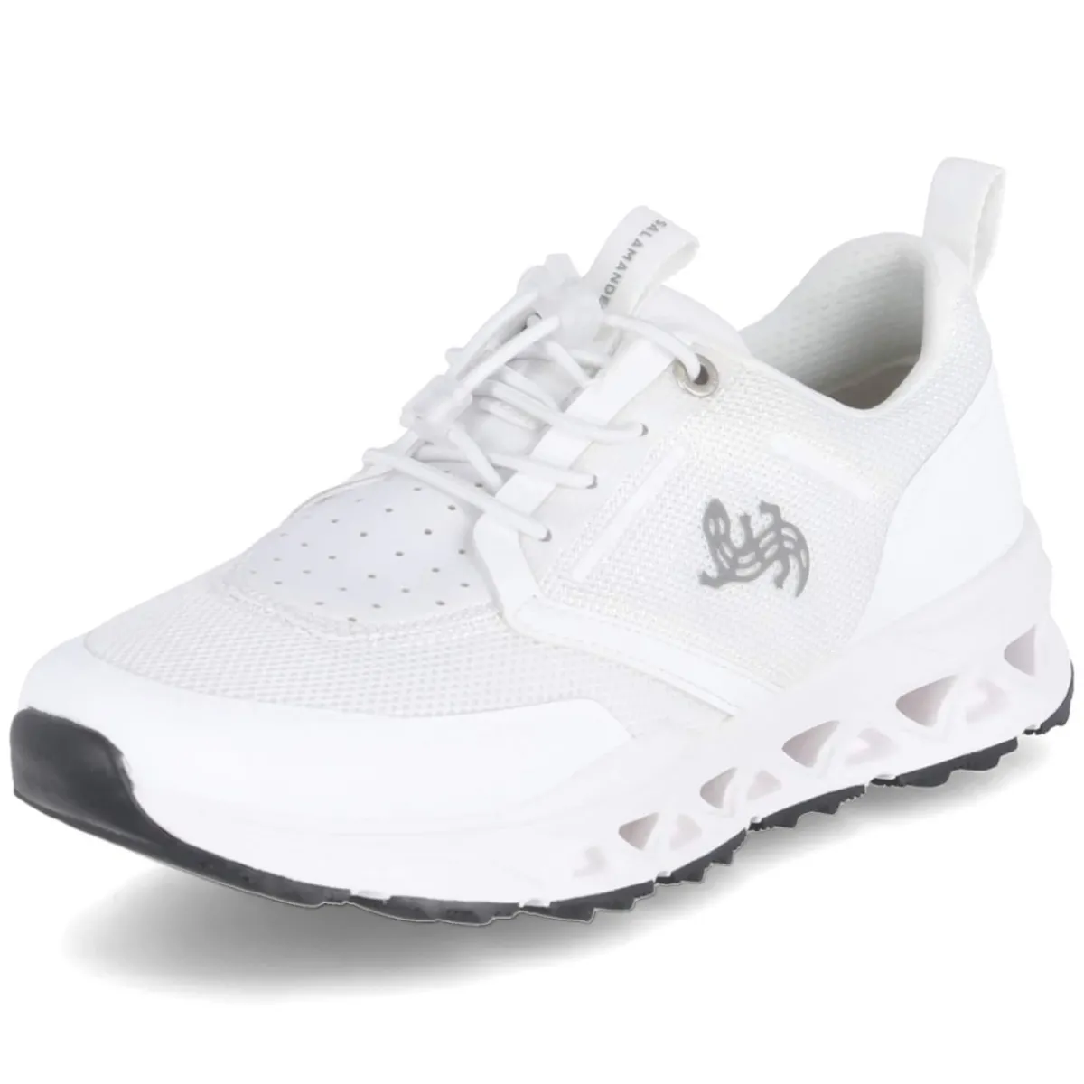 Urbaner Minimalismus trifft Komfort: Der Salamander Low Sneaker für Damen zeigt sich in strahlendem Weiß und setzt mit rund zulaufender Spitze und modernem Material-Mix aus Textil und Synthetik auf zeitlose Sportlichkeit. Der praktische Schnellverschluss wird von einem Elastikband unterstützt und sorgt für einen flexiblen Sitz, während gepolsterter Einstieg sowie verstärkter Fersen- und Zehenbereich zuverlässigen Halt geben. Innen verwöhnt ein herausnehmbares, weich gepolstertes Fußbett mit Lederdecksohle, ideal für individuelle Einlagen. Die flexible Laufsohle mit Grip und luftgepolsterter, sportlicher Basis federt jeden Schritt ab und macht den Sneaker zum souveränen Begleiter im Alltag. Dank normaler Passform fällt das Modell größengetreu aus; eine Anziehlasche erleichtert das Hineinschlüpfen. Modetipp: Besondere Frische entfaltet das cleane Design zu Ton-in-Ton-Looks in Weiß und Creme oder als Kontrast zu fließenden Midi-Röcken.