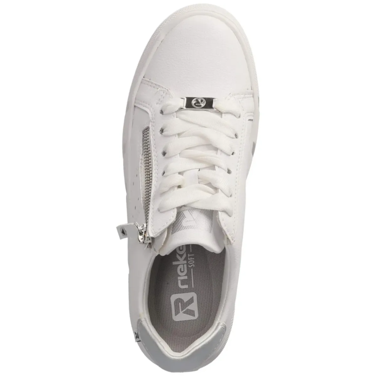Der weiße Low Sneaker von Rieker verbindet sportliche Leichtigkeit mit durchdachtem Komfort. Glattes, atmungsaktives Echtleder formt das klare Obermaterial, silberfarbene Akzente setzen dezente Highlights. Die runde Schuhspitze sorgt für eine angenehme Zehenfreiheit, während eine verstärkte Ferse Stabilität gibt. Schnürsenkel und ein seitlicher Reißverschluss erleichtern das An- und Ausziehen und erlauben eine passgenaue Regulierung. Innen überzeugt eine textile Decksohle über einem weich gepolsterten Wechselfußbett, das bei Bedarf unkompliziert gegen eigene Einlagen getauscht werden kann. Der leicht gepolsterte Einstieg schont den Knöchel, die flexible, rutschhemmende Laufsohle bietet verlässlichen Grip im Alltag. Der Sneaker fällt normal aus und eignet sich ideal für Erwachsene, die Komfort und Zurückhaltung schätzen. Modetipp: Zu Cropped-Jeans und hellen Strickteilen entsteht ein cleanes City-Outfit.