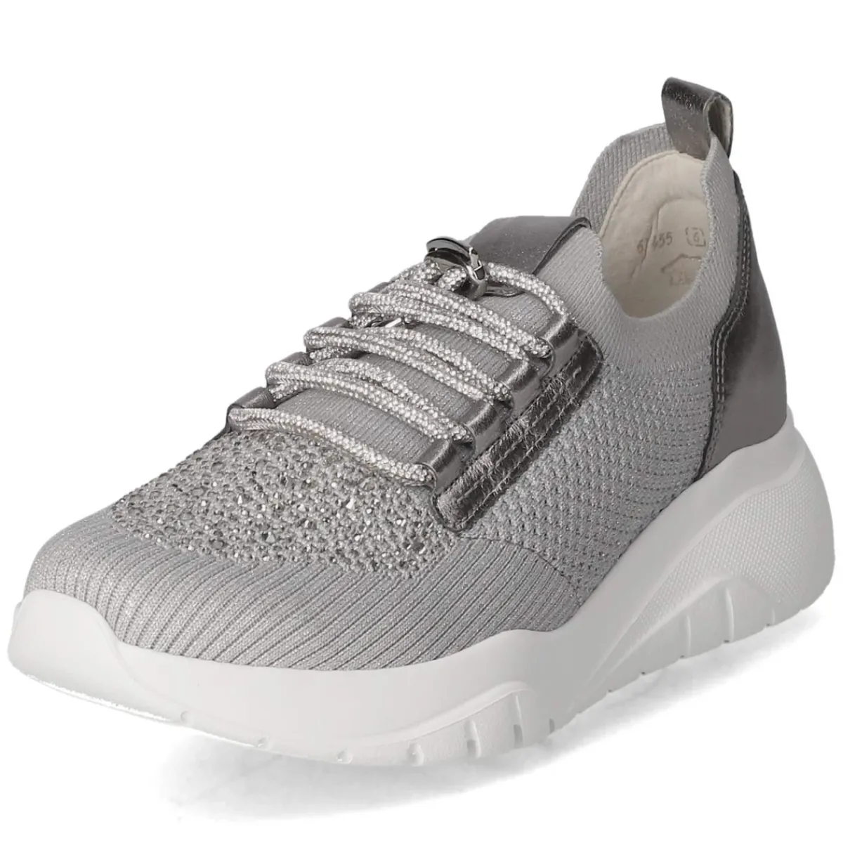 Gabor Low Sneaker in Grau verbindet sportliche Leichtigkeit mit edler Optik. Das Obermaterial aus Leder und Textil zeigt sich teils in atmungsaktivem Mesh, das zusammen mit dem leichten Textilobermaterial für angenehmes Klima sorgt. Silberfarbene Schmucksteine und ein eleganter Schimmer setzen dezente Akzente, während die runde Schuhspitze den femininen Look abrundet. Der Schnellverschluss mit Anziehlasche ermöglicht unkompliziertes Hineinschlüpfen, unterstützt durch den leichten Stretcheinstieg. Innen bietet die lederne Decksohle mit gepolstertem, komfortablem Wechselfußbett langanhaltenden Komfort; bei Bedarf lässt es sich austauschen. Die flexible Laufsohle federt Schritte weich ab. Der Sneaker fällt normal aus und richtet sich an Damen. Modetipp: Besonders harmonisch wirkt das graue Modell zu monochromen Outfits in Offwhite oder Taupe, ergänzt durch eine strukturierte Strickjacke für einen lässig-eleganten City-Look.