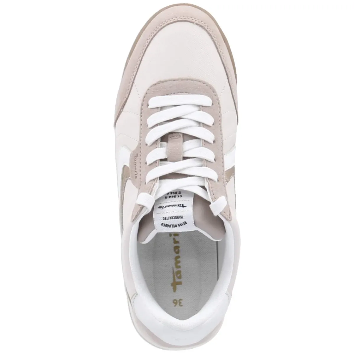 Der Low Sneaker von Tamaris verbindet sportliche Lässigkeit mit feinen Details. Das beige Design erhält durch die weißen und metallisch bronzefarbenen Seitenstreifen einen eleganten Akzent, der den modernen Material-Mix aus Synthetik, Leder und Textil betont. Die runde Spitze und die klassische Schnürung sorgen für zeitlose Optik, während der gepolsterte Einstieg und das komfortable Wechselfußbett für spürbare Bequemlichkeit stehen. Als relaxtes Leichtgewicht bietet das Modell auch an langen Tagen ein angenehmes Tragegefühl. Verstärkungen an Ferse und Zehenbereich erhöhen die Stabilität, die flexible, rutschfeste Laufsohle gibt sicheren Halt. Die textile Decksohle schmeichelt dem Fuß, der Größenhinweis fällt normal aus. Modetipp: Mit cremefarbener Wide-Leg-Pants, feinem Strick und einer Crossbody-Bag in Bronze entsteht ein harmonischer Ton-in-Ton-Look mit edlem Glanzmoment.