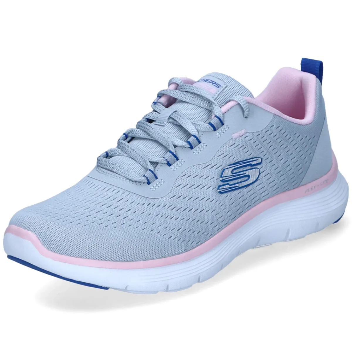 Der Low Sneaker FLEX APPEAL 5.0 von Skechers verbindet sportlichen Look mit hohem Tragekomfort. Das atmungsaktive Mesh-Obermaterial in Grau wird von zarten rosa und blauen Akzenten belebt und formt mit der runden Schuhspitze eine moderne Silhouette. Dank Schnürung mit praktischen Klettdetails sitzt der Schuh sicher, während der gepolsterte Einstieg und die Anziehlasche das Handling erleichtern. Das Highlight bildet die bewährte Memory-Foam-Decksohle, die Schritt für Schritt dämpft und sich an die Fußform anpasst. Die flexible, profilierte Laufsohle sorgt für guten Grip im Alltag, der Größenhinweis fällt normal aus. Besonders pflegeleicht: Das Modell ist waschmaschinengeeignet. Aus veganen Materialien gefertigt, überzeugt der Sneaker auch in puncto Materialauswahl. Modetipp: Zu verkürzten Straight-Leg-Jeans und einem leichten Stricktop kommt die schlanke Form besonders gut zur Geltung.