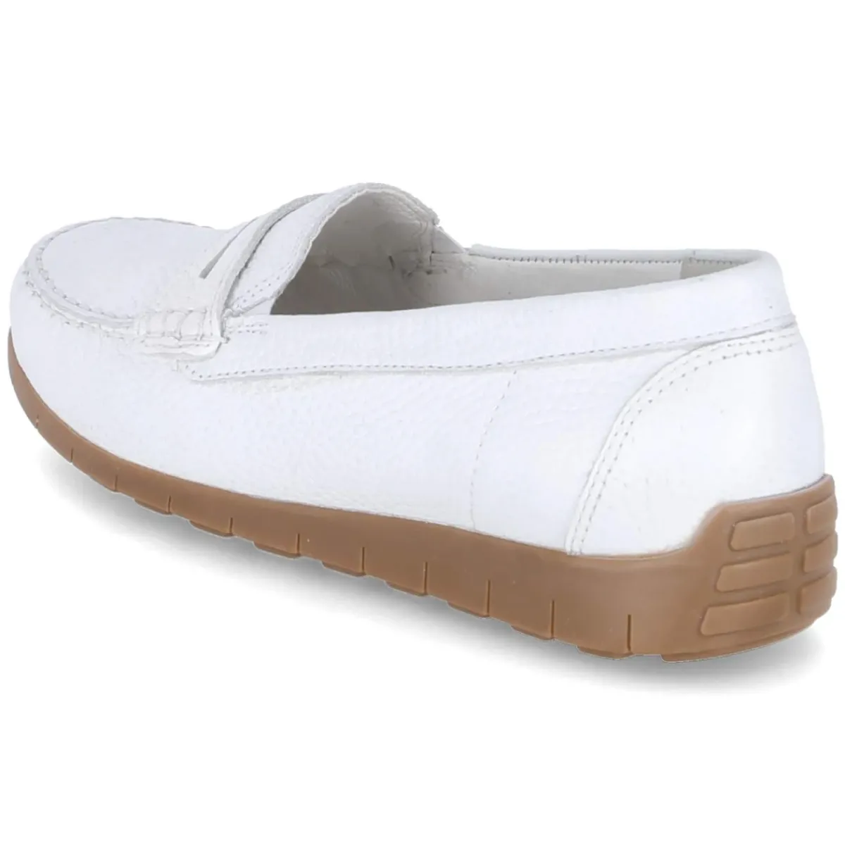 Mokassins LUCY von Waldläufer vereinen zeitlose Eleganz mit durchdachtem Komfort. Feines, weißes Glattleder in robuster Qualität schmiegt sich dank rund zulaufender Form angenehm an den Fuß, Ziernähte und klassischer Zierriemen unterstreichen den authentischen Mokassin-Charakter. Ein verstärkter Einstieg und die stabilisierte Ferse geben Halt, während Lederfutter und das gepolsterte, herausnehmbare Lederfußbett mit Wechselfunktion für wohltuende Dämpfung auf langen Tagen sorgen – auch ideal für eigene Einlagen. Die flexible, rutschhemmende Laufsohle unterstützt einen natürlich-weichen Abrollvorgang. Fällt größengetreu aus und lässt sich mühelos kombinieren, vom City-Look bis zum Büro. Modetipp: Zu cremefarbenen Chinos und einem lockeren Stricktop entsteht ein klarer, sommerlicher Auftritt.