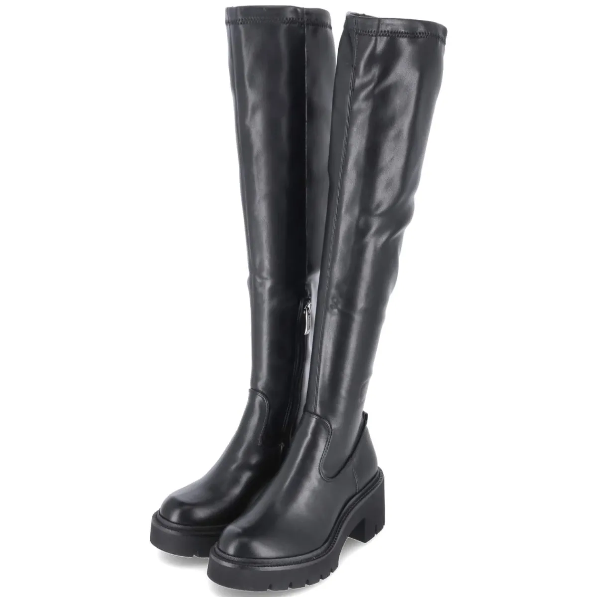 Eleganter Overkneestiefel von Tamaris, der feminine Linien mit Alltagstauglichkeit verbindet. Das schwarze Obermaterial aus Synthetik ist komplett vegan und formt mit runder Spitze eine zeitlose Silhouette. Der 7 cm hohe Blockabsatz streckt, bleibt aber angenehm stabil. Innen sorgt eine textile Decksohle mit gepolstertem Fußbett für weichen Auftritt. Der leicht stretchige Schaft (ca. 50 cm Höhe, 36 cm Umfang) schmiegt sich an und lässt genügend Bewegungsfreiheit. Dank praktischem Reißverschluss gelingt das An- und Ausziehen im Handumdrehen. Eine starke, rutschfeste Profilsohle und die verstärkte Ferse geben sicheren Halt, während die Passform größengetreu ausfällt. Ein vielseitiger Begleiter zu City- und Abendlooks. Modetipp: Mit Strickkleid und Wollmantel entsteht ein harmonischer Kontrast aus weicher Textur und klarer Stiefel-Linie.