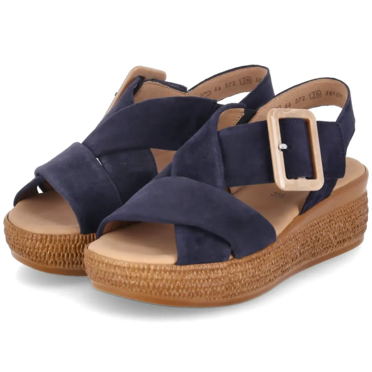 Die blauen Plateausandaletten von Gabor vereinen sommerliche Leichtigkeit mit komfortbetontem Design. Das Obermaterial aus feinem Rauleder zeigt eine samtige Oberfläche, die dem Modell eine edle Anmutung verleiht. Offene Schuhspitze, gepolstertes Fußbett und die 5 cm hohe Plateau-Absatzform sorgen für ein bequemes Laufgefühl mit sanfter Erhöhung. Ein bequemer Klettverschluss erleichtert das An- und Ausziehen; der Klettverschlussriemen mit Zierschnalle setzt einen dezenten Akzent. Zusätzlichen Halt bietet der Knöchelriemen mit Elastikeinsatz. Die Decksohle aus Leder schmiegt sich angenehm an, während der Sohlenrahmen in Flechtoptik sommerliche Nuancen aufnimmt. Das Modell fällt normal aus und eignet sich für verschiedenste Anlässe von City bis Urlaub. Modetipp: Zu hellen Leinenhosen und einer luftigen Bluse wirken die Blautöne besonders frisch; goldfarbener Schmuck greift die Zierschnalle stilvoll auf.