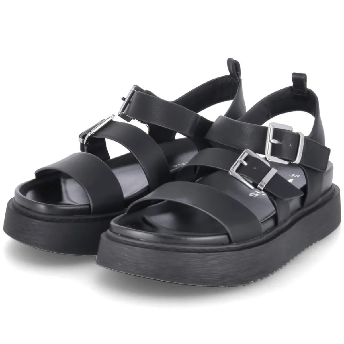 Diese Römer-Sandalen von Tamaris in klassischem Schwarz verbinden zeitloses Design mit viel Tragekomfort. Das hochwertige Obermaterial aus Synthetik besteht aus veganen Materialien und umschließt den Fuß mit zwei elegant geführten Riemen: Der vordere ist als Klettverschlussriemen mit dekorativer Schnalle und Elastikeinsatz gearbeitet, der zweite schließt über eine Schnalle. Die offene Schuhspitze und das weich gepolsterte, vorgeformte Fußbett aus Synthetik sorgen auch an langen Tagen für ein angenehmes Gefühl. Ein 4 cm hohes Plateau verleiht zusätzliche Höhe und Stabilität, der bequeme Klettverschluss erleichtert das An- und Ausziehen. Der Schnitt fällt normal aus und bietet zuverlässigen Halt. Modetipp: Besonders stimmig wirken die Sandalen zu fließenden Midi-Kleidern oder Leinen-Culottes in neutralen Tönen, dazu eine strukturierte Korbtasche für einen modernen City-Look.