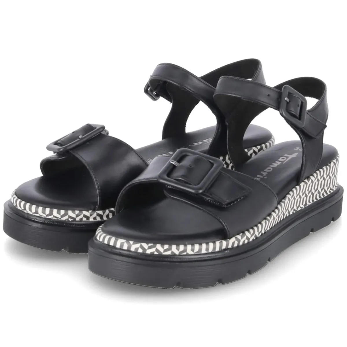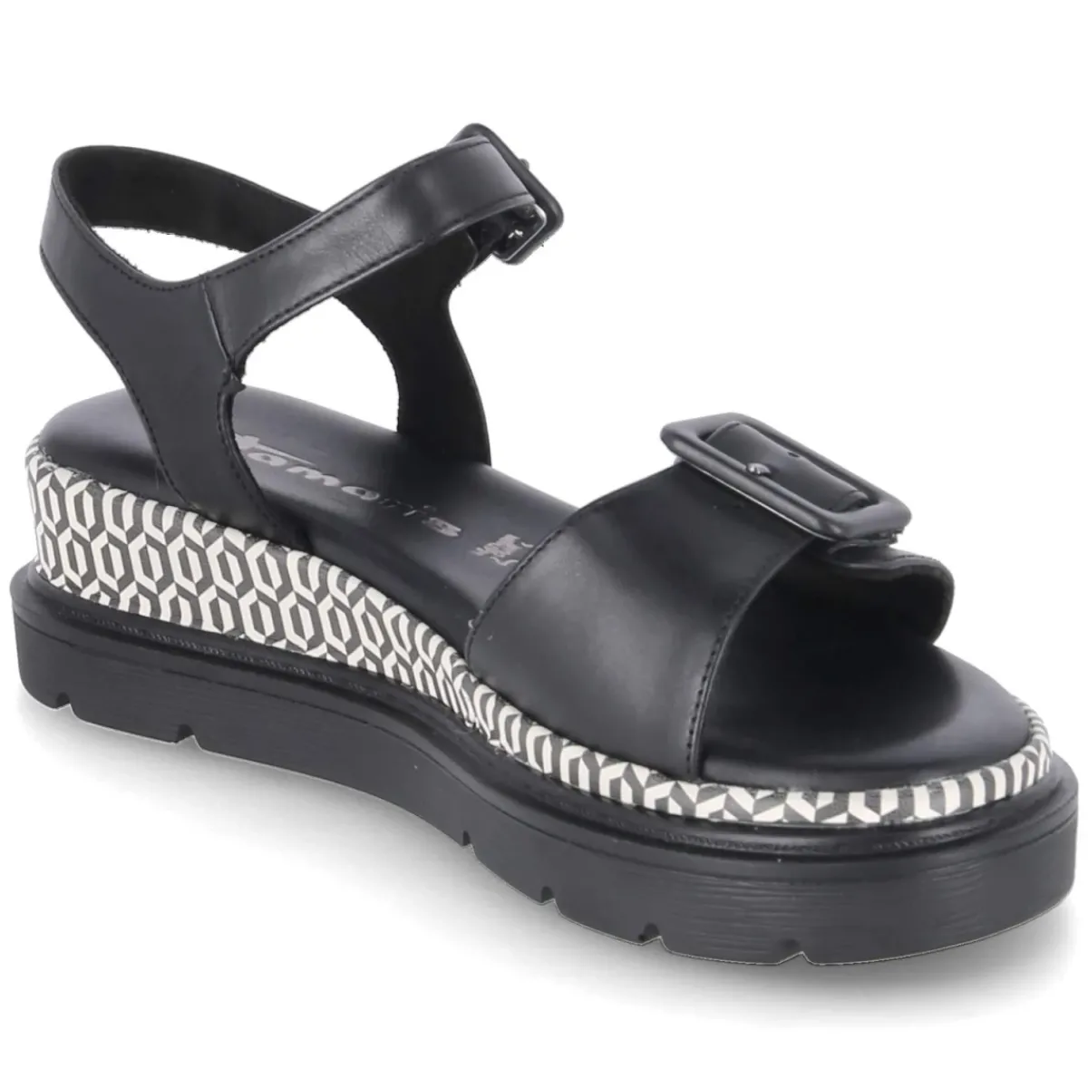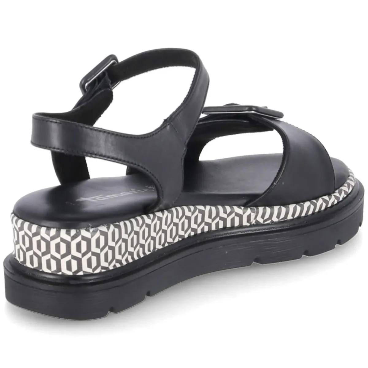 Diese Damen-Sandalen von Tamaris setzen auf zeitloses Design und hohen Tragekomfort. Schwarzes Glattleder umschließt den Fuß in klaren Linien, die offene Schuhspitze sorgt für luftiges Gefühl an warmen Tagen. Zwei Klettverschlussriemen mit verstellbarer Schnalle erlauben eine passgenaue Einstellung, während das gepolsterte Fußbett auf einer Decksohle aus Leder sanfte Dämpfung bietet. Das langlebige Echtleder zeigt sich formstabil und anschmiegsam, die starke Laufsohle gewährleistet Halt auf verschiedensten Untergründen. Eyecatcher ist das geometrische Rahmenmuster im Retrodesign in Schwarz-Weiß, das dem minimalistischen Look eine grafische Note verleiht. Der Schnitt fällt normal aus und erleichtert die Größenauswahl. Modetipp: Besonders stimmig wirkt das Modell zu einer monochromen Kombination aus schwarzer Culotte und feinem Stricktop, akzentuiert mit silbernen Kettendetails.