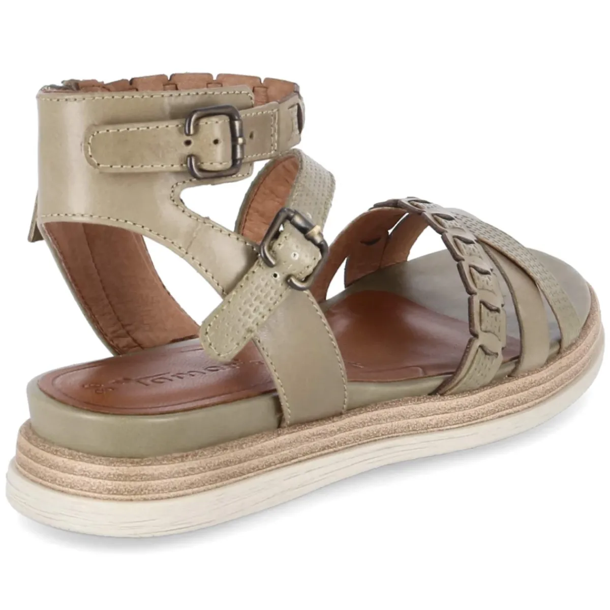 Die grünen Sandalen von Tamaris kombinieren feminines Design mit durchdachter Funktion. Ein moderner Material-Mix aus Leder und Synthetik schmeichelt dem Fuß, während teils gemusterte Riemchen und feine Flechtelemente den Look lebendig machen. Die offene Schuhspitze sorgt für eine luftige Silhouette, die Decksohle aus Leder & Synthetik und das weich gepolsterte Fußbett bieten angenehmen Komfort auch an längeren Tagen. Ein bequemer Reißverschlußeinstieg am Fersenriemen erleichtert das An- und Ausziehen; zusätzlich ermöglichen zwei Schnallen die individuelle Weitenregulierung. Die flexible, rutschfeste Laufsohle gibt sicheren Halt auf sommerlichen Wegen. Der Fit fällt normal aus, ideal für erwachsene Damen. Modetipp: Mit Leinenkleid in Naturtönen und einer Korbtasche getragen, setzt das frische Grün stilvolle Akzente.