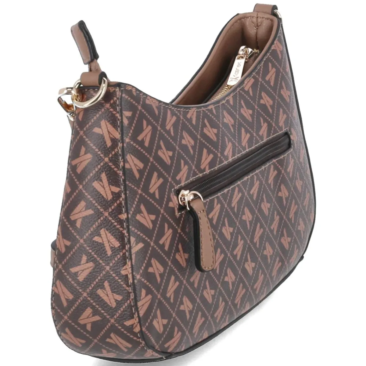 Diese braune Schultertasche setzt mit Allover-Markenprint und golden glänzenden Metallelementen ein souveränes Statement. Das kompakte Format mit ca. 15 x 29 x 6 cm und etwa 2,5 Litern Volumen bietet Platz für Essentials, während der sichere Reißverschluss alles zuverlässig schützt. Ein verstärkter Boden sorgt für formstabilen Stand. Praktisch: hinten ein RV-Fach für schnellen Zugriff, innen ein Steckfach und ein weiteres RV-Fach für strukturierte Ordnung. Der lange, verstellbare Gurt mit ca. 130 cm ermöglicht den Crossbody-Tragekomfort, der kurze Riemen mit ca. 50 cm die elegante Hand- oder Schultervariante. Modetipp: Den warmen Braunton mit Creme, Karamell und Goldschmuck kombinieren, dazu ein taillierter Blazer und schmale Denim – so entsteht müheloser City-Chic mit grafischem Print-Fokus.