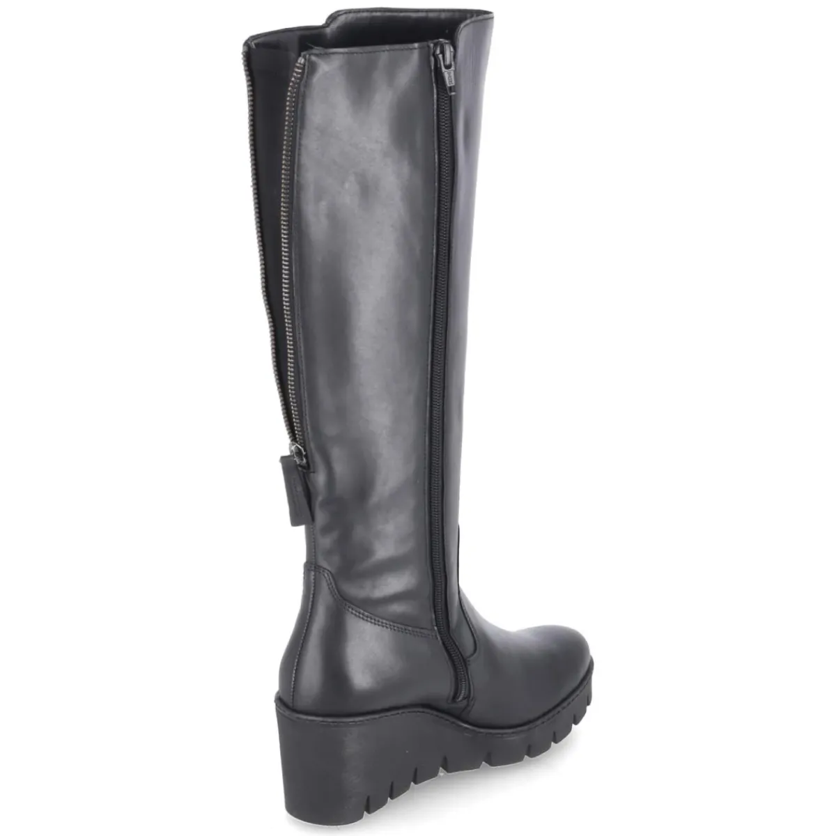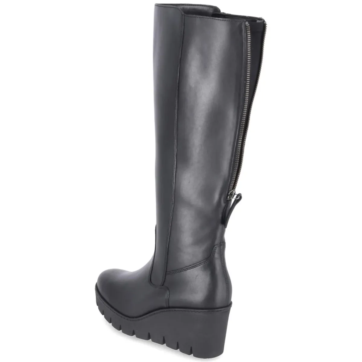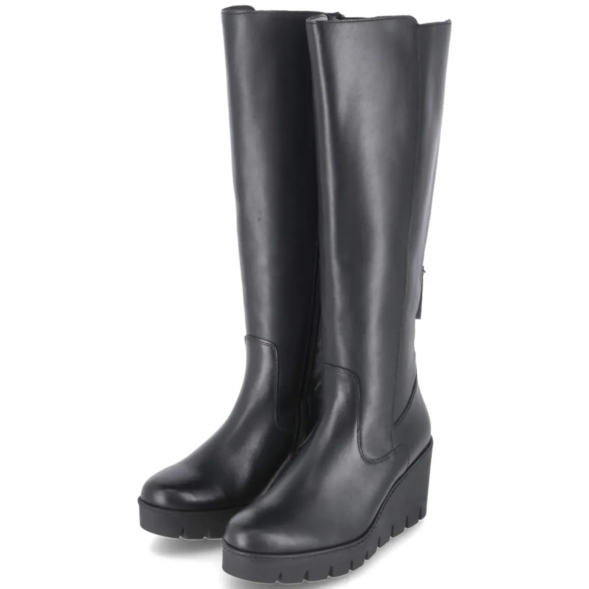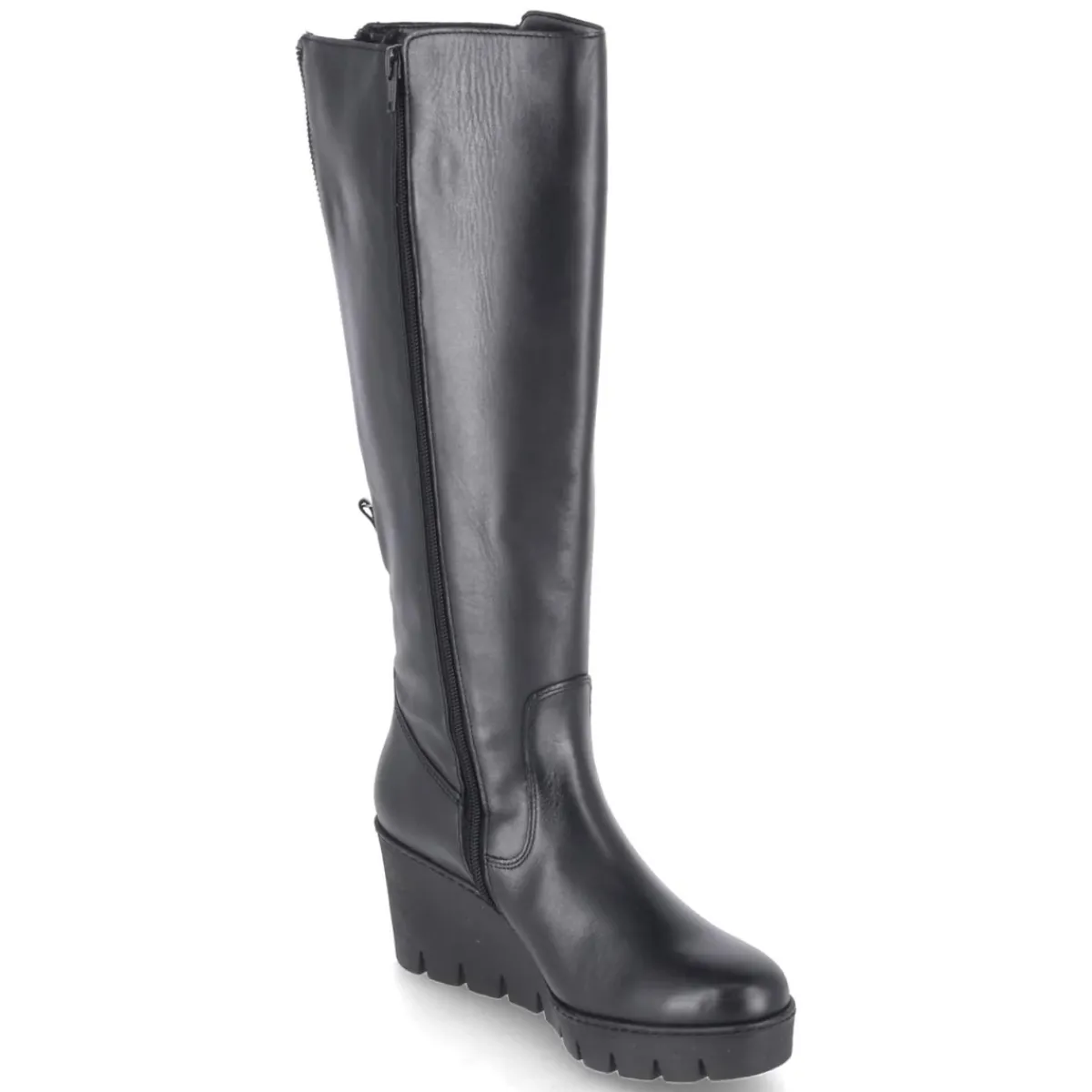 Der schwarze Damen-Stiefel von Gabor verbindet feminine Linien mit urbaner Funktionalität. Der moderne Material-Mix aus Leder und Synthetik verleiht Struktur und Glanznuancen, während der runde Leisten zeitlose Eleganz bringt. Ein 7,5 cm hoher Keilabsatz sorgt für Höhe und Stabilität, das kleine Plateau und die rutschfeste Profilsohle unterstützen einen trittsicheren Gang. Die textile Decksohle und das komfortable Wechselfußbett erhöhen den Tragekomfort, bei Bedarf lässt sich eine eigene Einlage einsetzen. Praktisch sind der seitliche Reißverschluss sowie der hintere Schaftzipper zur variablen Schafterweiterung. Die Passform fällt normal aus und begleitet zuverlässig durch lange Tage – für den perfekten Auftritt im Alltag wie am Abend. Modetipp: Mit Midirock in Satinoptik und grobem Strick entsteht ein spannender Kontrast, abgerundet durch eine schmale Crossbody-Bag.