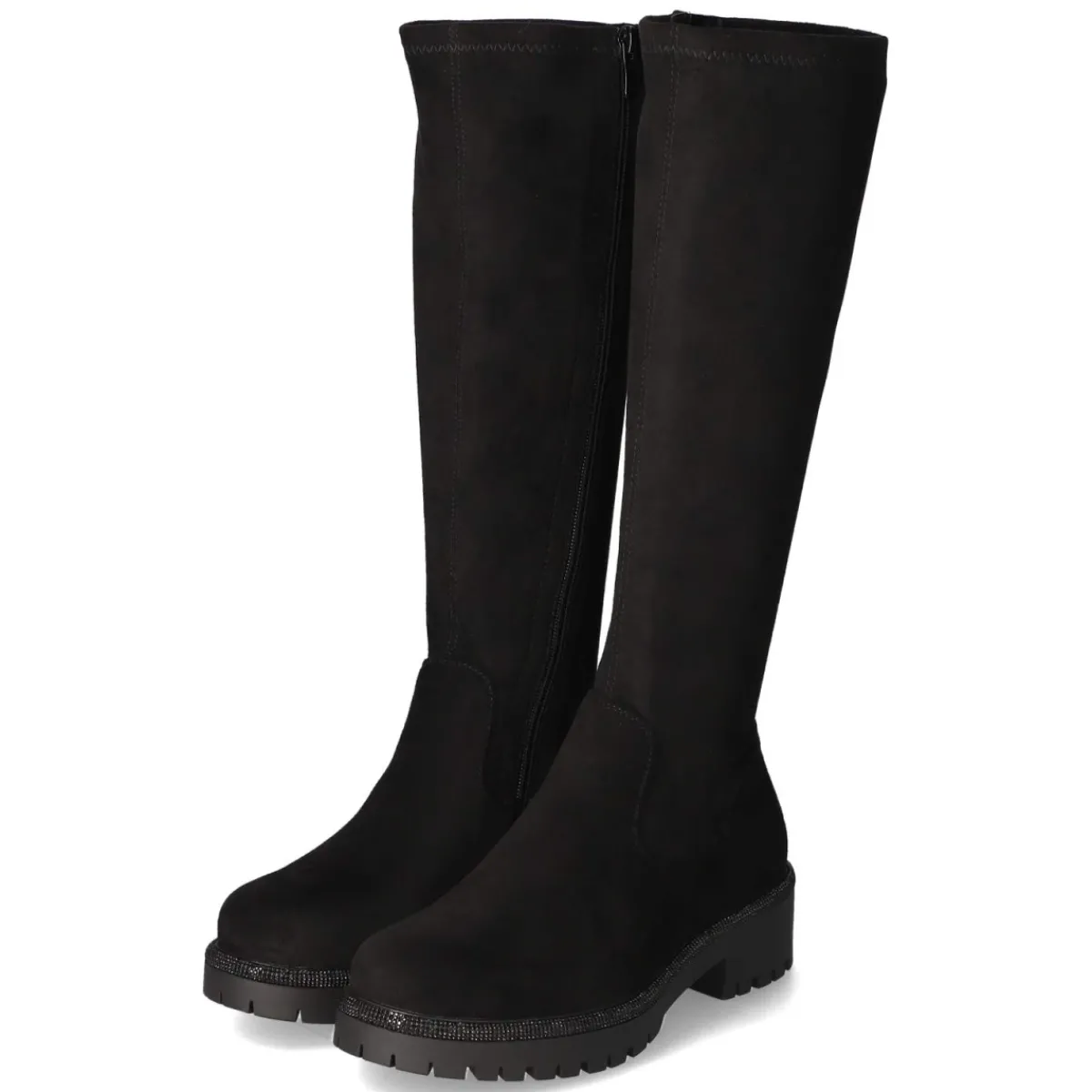 Damenstiefel von La Strada mit klarer Linienführung und komfortabler Ausstattung. Das schwarze, leichte Textilobermaterial umschmeichelt das Bein, die runde Spitze und der 4 cm hohe Blockabsatz setzen auf elegante Zurückhaltung mit sicherem Stand. Ein bequemer Reißverschlußeinstieg erleichtert das Anziehen, innen sorgt ein gepolstertes Fußbett für angenehmen Tragekomfort. Der Schaft misst ca. 39 cm in der Höhe und 34 cm im Umfang, ein leichter Stretchanteil verbessert die Passform. Verstärkte Zehen- und Fersenbereiche erhöhen die Strapazierfähigkeit, die profilierte Laufsohle bietet Grip im Alltag. Der Fußrahmen mit dezenten Schmucksteinen verleiht dem schlichten Design subtilen Glanz. Fällt normal aus und begleitet sicher durch Büro, Freizeit und Abendprogramm. Modetipp: Mit Strickmidikleid und Trenchcoat kombinieren, dazu eine filigrane Kettentasche für einen edlen City-Look.