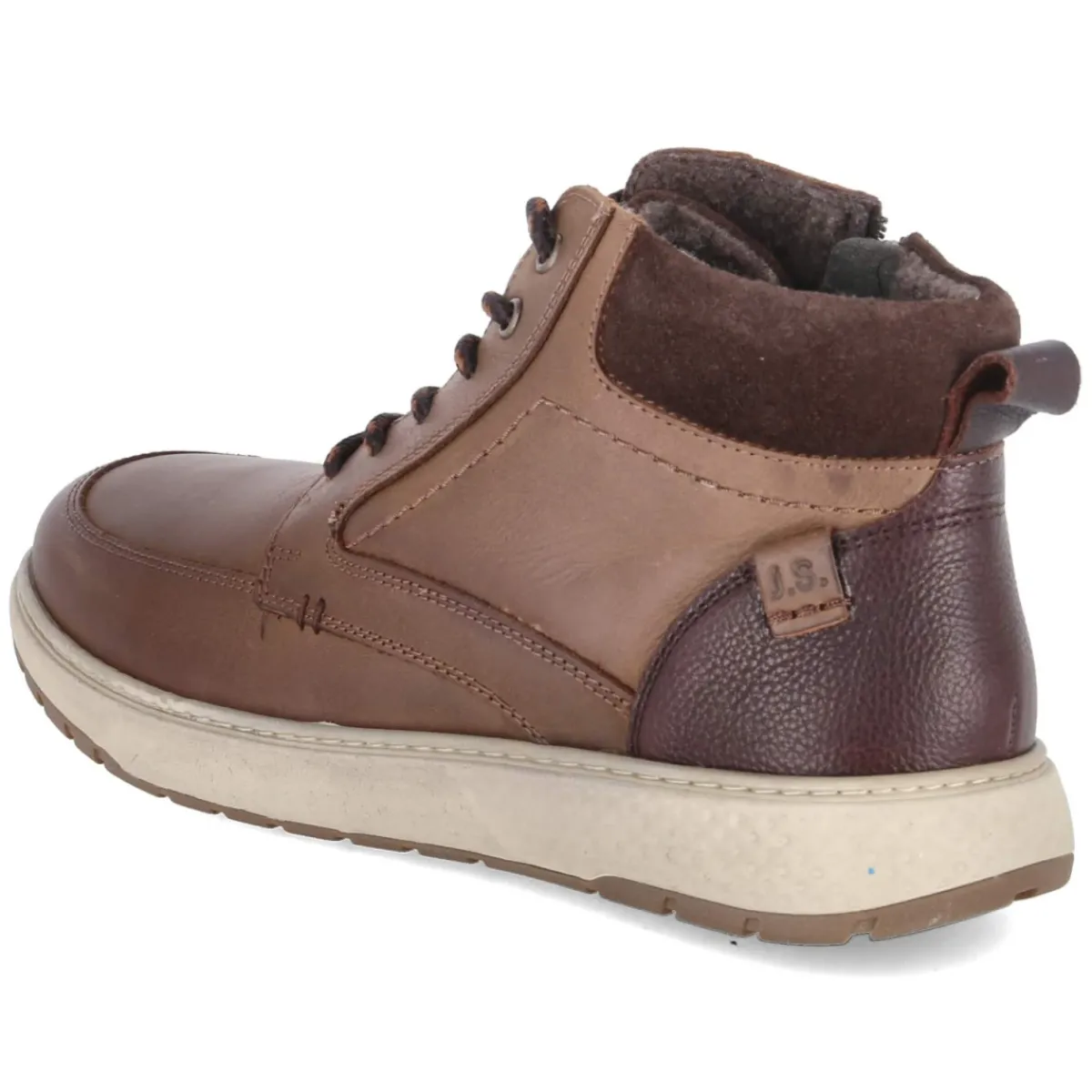 Die Stiefeletten CLAYTON 03 von Josef Seibel verbinden sportliche Optik mit alltagstauglichem Komfort. Hochwertiges Glattleder in warmem Braun und eine runde Spitze prägen den Look, subtile Markendetails setzen dezente Akzente. Schnürung und seitlicher Reißverschluss erleichtern den Einstieg, unterstützt von Anziehlasche und gepolstertem Schaftrand. Das leichte Futter wärmt an kühlen Tagen, während das gut gepolsterte, herausnehmbare Fußbett und die textile Decksohle angenehme Dämpfung bieten. Verstärkter Fersen- und Zehenbereich sorgt für Formstabilität und Langlebigkeit. Der Schnitt fällt normal aus und passt erwachsenen Herren zuverlässig. Modetipp: Besonders stimmig zu dunkelblauen Chinos, einem grob gestrickten Rollkragenpullover und einem Wollmantel in Kamel oder Navy für einen lässig-smarten Herbstauftritt.