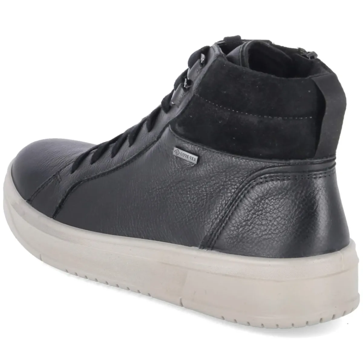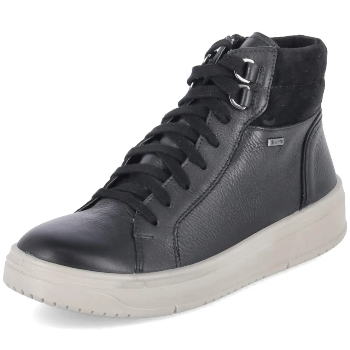 Legero Stiefeletten in Schwarz verbinden sportliches Design mit wetterfester Funktion. Glattes Leder mit GORE-TEX-Ausstattung und wasserfestem Obermaterial schützt zuverlässig vor Nässe, während die wasserabweisende Verarbeitung und das leichte Futter an kühlen Tagen für angenehmes Klima sorgen. Der gepolsterte Einstieg, die verstärkte Ferse und eine flexible Laufsohle mit Grip bieten Komfort und Halt im Alltag. Praktisch: Schnürung für individuelle Weite, seitlicher Reißverschluss für schnellen Einstieg, ergänzt durch Anziehlasche. Die runde Spitze und die Textil-Decksohle mit Wechselfußbett machen das Modell alltagstauglich und pflegeleicht. Fällt normal aus und passt zu erwachsenen Damen, die Funktion schätzen. Modetipp: Zu Straight-Leg-Jeans, Wollmantel und grobem Schal entsteht ein moderner City-Look, der mühelos vom Büro in die Freizeit wechselt.