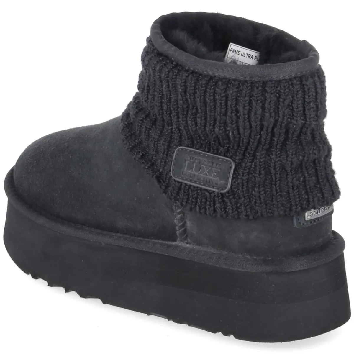 Winterboots FAME von Australia Luxe verbinden urbane Lässigkeit mit funktionalem Komfort. Der robuste Material-Mix aus Leder und Textil präsentiert sich in sattem Schwarz, betont durch markante Nähte. Ein warmes Lammfellfutter und die weiche Textildecksohle sorgen für ein behagliches Tragegefühl, während der gepolsterte Einstieg mit Umschlagkrempe und Lederpatch in Strickoptik sanft umschließt. Die starke, zugleich leichte Plateausohle mit 4,5 cm Absatzhöhe liefert Grip und moderne Proportionen; die runde Spitze und das Design ohne Verschluss machen den Einstieg unkompliziert. Eine verstärkte Ferse mit Metall-Label unterstreicht die hochwertige Verarbeitung. Fällt normal aus und bietet vielseitige Kombinationsmöglichkeiten vom City-Winter bis zum Wochenendtrip. Modetipp: Ton-in-Ton zu schwarzen Leggings, Oversize-Strick und einem langen Mantel tragen – so wirkt die Plateau-Form besonders elegant.
