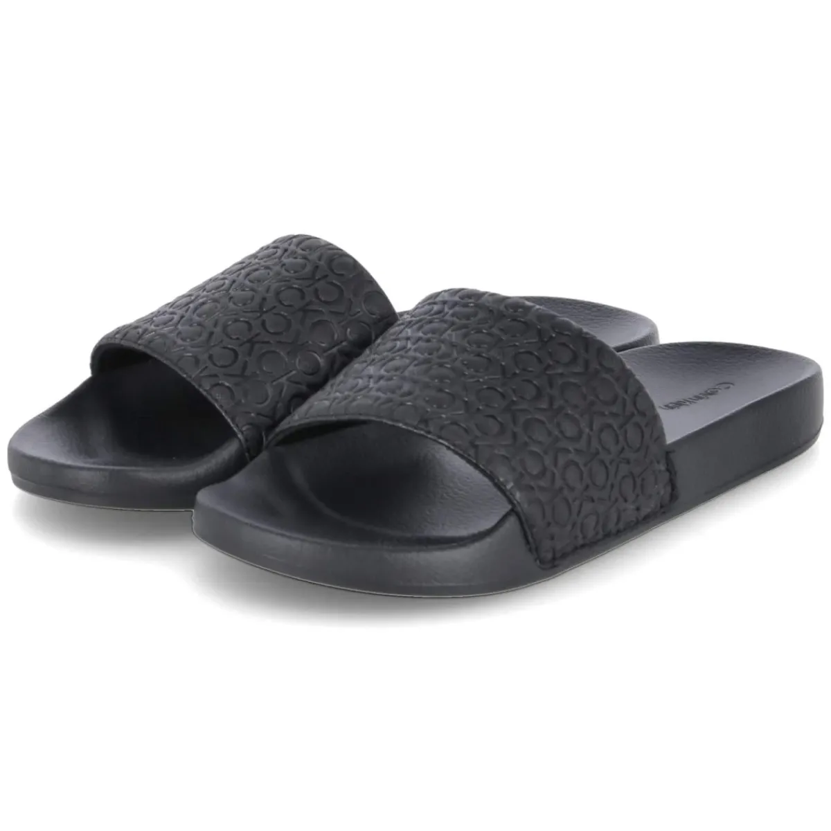 Die Calvin Klein POOL SLIDE MONO zeigt minimalistischen Style mit markanter Signatur. Der gepolsterte Riemen aus pflegeleichter Synthetik trägt tonale CK-Prägungen, die dem schwarzen Design eine dezent gemusterte Optik geben. Dank offener Schuhspitze und Verschlussfreiheit gelingt das Hineinschlüpfen bequem, die vorgeformte Decksohle stützt den Fuß an langen Tagen am Pool oder in der City. Eine flexible Laufsohle mit leichtem Profil sorgt für trittsicheren Komfort auf glatten Untergründen. Synthetik als Ober- und Deckmaterial ist unempfindlich gegenüber Feuchtigkeit und lässt sich mühelos reinigen. Der moderne, schlanke Leisten fällt schmaler aus; bei kräftigerem Fußspann empfiehlt sich die Wahl der größeren Größe. Modetipp: Zu schwarzen Swimshorts und weißem Leinenhemd entsteht ein cleaner Resort-Look, urban funktioniert die Slide mit schmaler Chino-Shorts und Oversize-Tee im Ton-in-Ton-Styling.