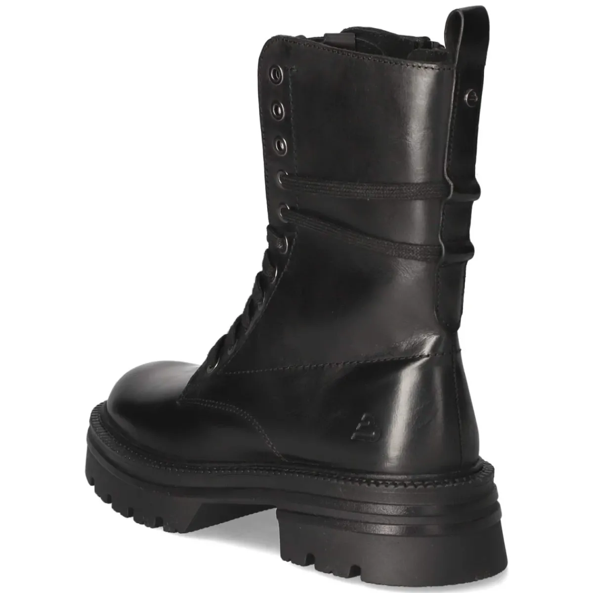 Schwarze Bullboxer-Boots vereinen robuste Alltagstauglichkeit mit klarer Linienführung. Glattes, atmungsaktives Echtleder schmiegt sich formstabil an, die runde Spitze sorgt für angenehme Zehenfreiheit. Ein 4 cm hoher Blockabsatz bietet sicheren Stand, unterstützt von einer rutschfesten Profilsohle für Halt auf wechselndem Untergrund. Schnürsenkel und ein zusätzlicher seitlicher Reißverschluss erleichtern den Einstieg; Anziehlasche und dezentes Markendetail runden das Design ab. Innen sorgt ein gepolstertes Fußbett mit synthetischer Decksohle für Komfort über den ganzen Tag. Das Modell fällt normal aus und richtet sich an Damen, die schlichte Vielseitigkeit schätzen. Modetipp: Zu Straight-Leg-Jeans, grob gestricktem Cardigan und langem Mantel entsteht ein moderner City-Look.