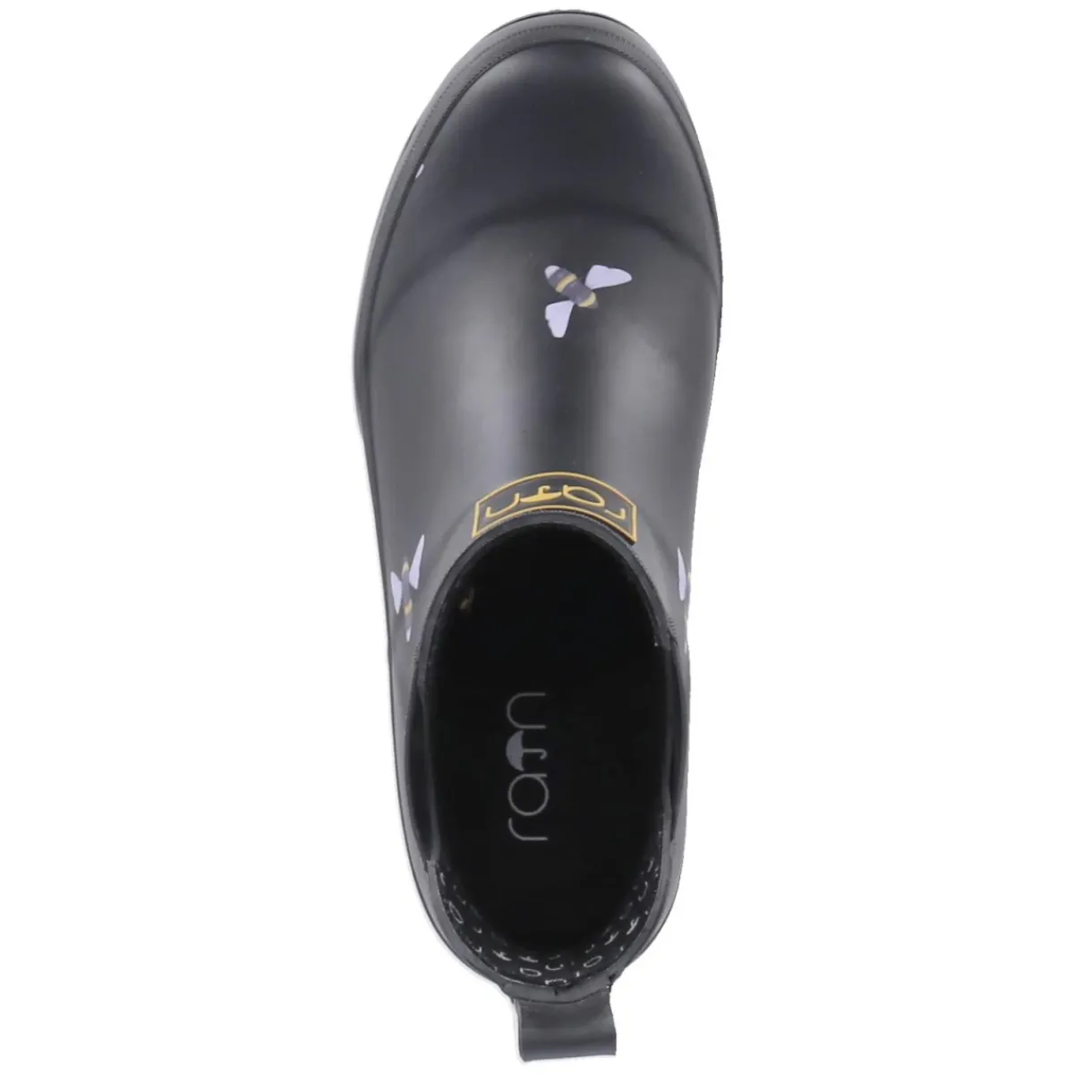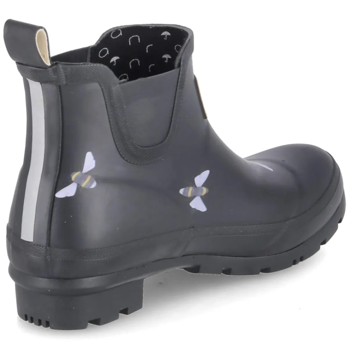 Der Chelsea Boot BEE von Rajn in klassischem Schwarz verbindet urbanes Design mit wettertauglicher Funktion. Das Obermaterial aus Gummi hält Feuchtigkeit zuverlässig ab, die seitlichen Elastikeinsätze und die Anziehlasche sorgen für einen unkomplizierten Einstieg. Mit rund zulaufender Spitze, blockigem 3 cm Absatz und verstärktem Fußrahmen steht das Modell für Stabilität im Alltag. Das gepolsterte, herausnehmbare Wechselfußbett auf textiler Decksohle bietet angenehme Dämpfung und lässt sich bei Bedarf gegen eigene Einlagen tauschen. Reflektierende Details inklusive Fersenstreifen erhöhen die Sichtbarkeit bei Dämmerung, während die flexible, rutschhemmende Profilsohle sicheren Halt gibt. Der dezente Bienenprint setzt einen charaktervollen Akzent, der das moderne Erscheinungsbild abrundet. Modetipp: In Kombination mit gerader Cropped-Jeans und einem oversized Wollmantel entsteht ein cleaner City-Look.