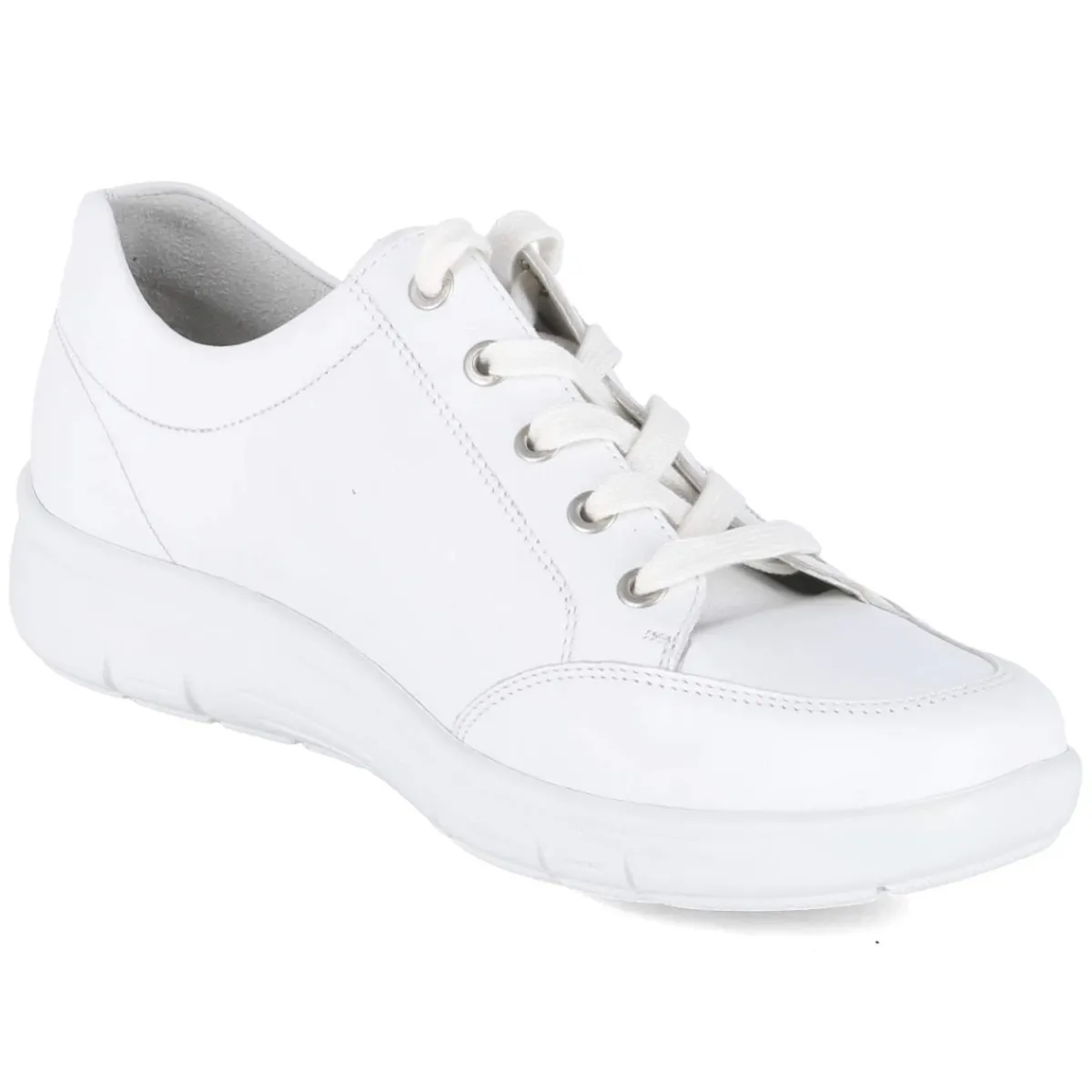 Dieser Damen-Halbschuh von Semler vereint sportliche Leichtigkeit mit verlässlichem Komfort. Weiches Glattleder in strahlendem Weiß umschließt den Fuß formschön, während der runde Leisten und ein gepolstertes, herausnehmbares Fußbett für entspanntes Gehen sorgen. Die textile Decksohle schmiegt sich angenehm an, der verstärkte Fersen- und Zehenbereich stabilisiert bei jedem Schritt. Ein Mix aus Schnürung und seitlichem Reißverschluss erleichtert das An- und Ausziehen, der zusätzliche Zipper bringt praktische Flexibilität. Seitliche Lochungen setzen dezente Akzente und unterstützen die Belüftung. Die flexible, rutschfeste Laufsohle gibt sicheren Halt auf verschiedenen Untergründen. Der Schnitt fällt normal aus und eignet sich ideal für den Alltag erwachsener Trägerinnen, die Wert auf Qualität legen. Modetipp: Zum cleanen Look wirken cropped Jeans, ein gestreifter Breton-Pullover und ein heller Trench besonders stimmig.