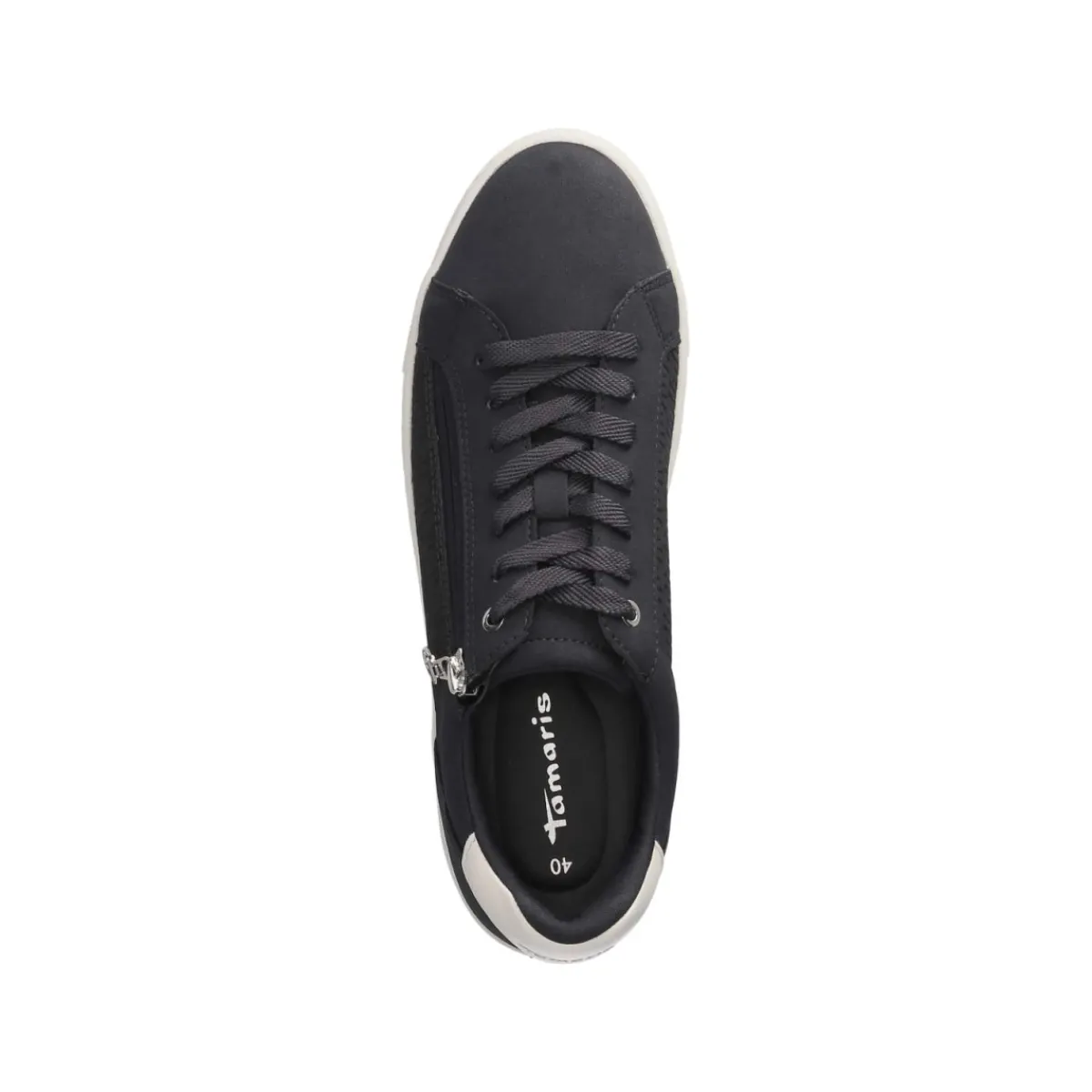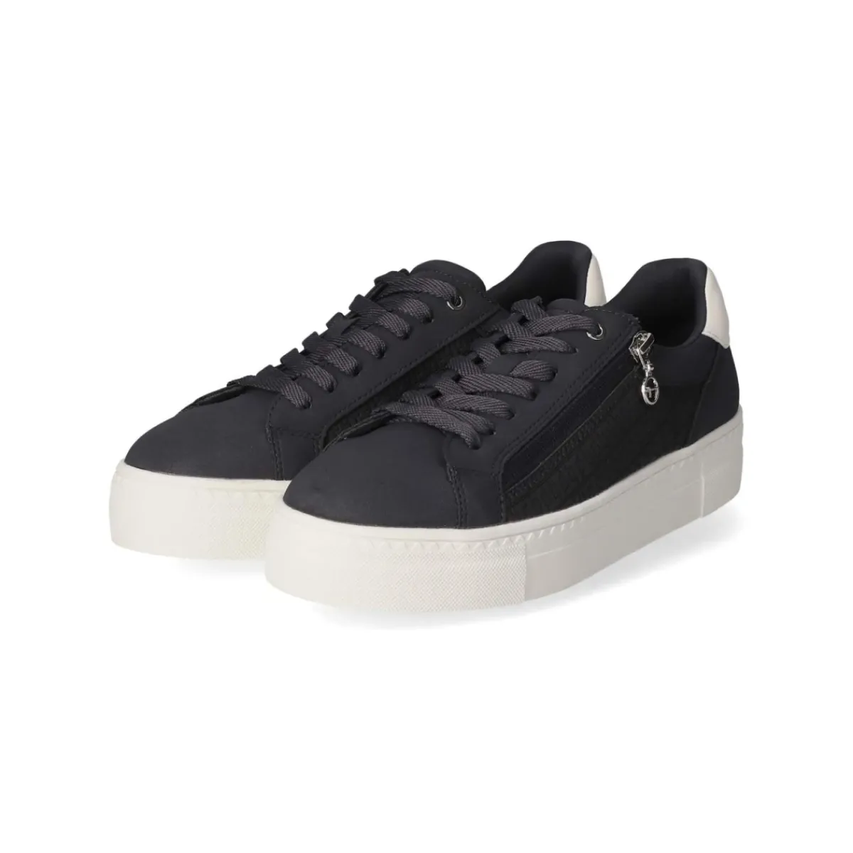 Der Low Sneaker von Tamaris in Blau verbindet urbanen Stil mit durchdachtem Komfort. Das Obermaterial aus Synthetik zeigt eine feine Markenmusterprägung, weiße Highlights und dezente Markendetails, während der verstärkte Fersenbereich und der leicht gepolsterte Einstieg sicheren Halt bieten. Ein 3,5 cm hohes Plateau sorgt für eine moderne Silhouette und angenehme Dämpfung. Praktisch im Alltag: die Kombination aus Schnürsenkeln und seitlichem Reißverschluss für einen bequemen Einstieg. Das herausnehmbare, komfortable Wechselfußbett und die textile Decksohle unterstützen ein angenehmes Fußklima, die rutschfeste Laufsohle gibt verlässlichen Grip. Mit runder Spitze, größengetreuem Sitz und veganen Materialien ist das Modell eine smarte Wahl für Damen und Erwachsene, die Wert auf Leichtigkeit und Stil legen. Modetipp: mit heller Straight-Jeans, gestreiftem Shirt und Blazer entsteht ein frischer, maritimer Look.