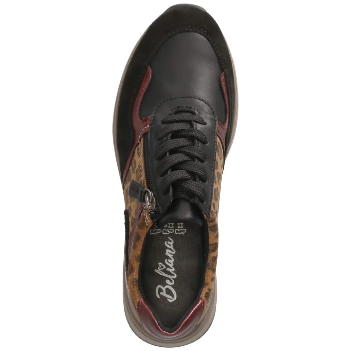 Der Low Sneaker VIVIAN 06 von Beliana kombiniert edles Glattleder in tiefem Schwarz mit einer elegant schimmernden Oberfläche und setzt mit Akzenten in Magenta und Gold sowie Partien im Animalprint ein ausdrucksstarkes Statement. Die abgerundete Spitze und der verstärkte Zehen- und Fersenbereich sorgen für eine harmonische Silhouette und langlebigen Schutz. Schnürsenkel und seitlicher Reißverschluss erleichtern den Einstieg, das herausnehmbare Wechselfußbett und die lederne Decksohle bieten ganztägigen Komfort. Eine flexible, griffige Laufsohle begleitet sicher durch den Abend – ideal für besondere Anlässe, wenn ein Hauch Sportivität auf Glamour trifft. Fällt normal aus und passt sich vielseitigen Looks an. Modetipp: Zu Satinkleid oder Smoking-Blazer kombinieren und die Farbakzente mit goldfarbenem Schmuck oder einer Magenta-Bag wiederaufgreifen.