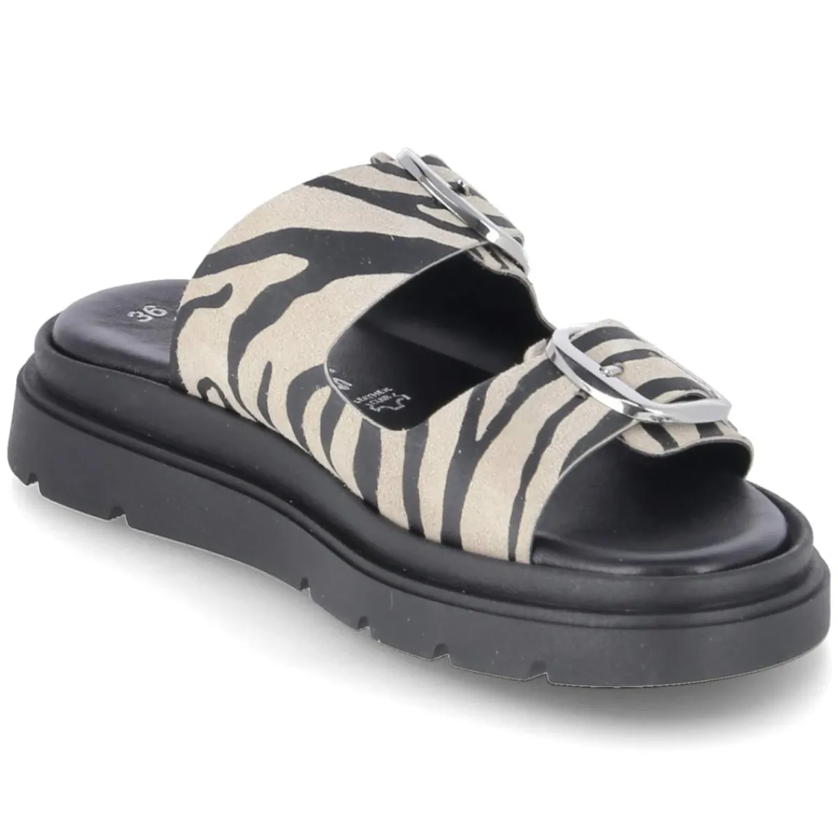 Diese Damen-Pantoletten von Tamaris verbinden markanten Look und hohen Komfort. Schwarzes Rauleder in langlebiger Echtleder-Qualität trifft auf ein ausdrucksstarkes Zebra-Animal-Print-Detail, das dem minimalistischen Design eine moderne Note gibt. Die offene Schuhspitze und die verstellbare Schnalle mit Elastikeinsatz sorgen für luftiges Tragegefühl und passgenauen Halt. Eine gepolsterte Lederdecksohle schont den Fuß, während die starke, rutschfeste Laufsohle mit griffigem Profil sicheren Tritt im Alltag bietet. Der Größenhinweis fällt normal aus und erleichtert die Wahl. Modetipp: Für einen edlen Monochrom-Look zu cropped schwarzer Jeans und Seidenbluse stylen oder als Eyecatcher zum weißen Leinenkleid einsetzen.