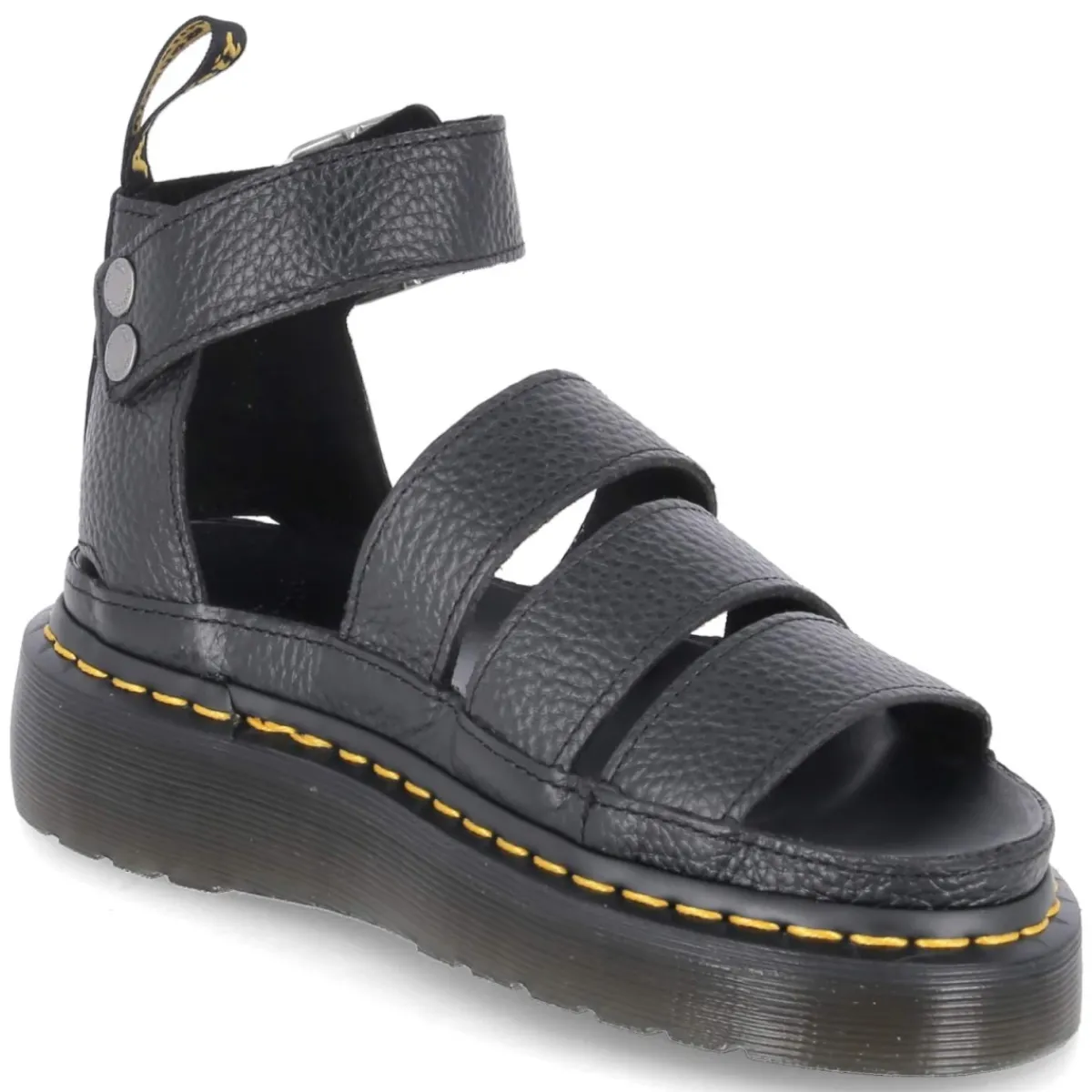 Die Sandalen CLARISSA 2 QUAD von Dr. Martens setzen ein markantes Statement: Schwarzes Glattleder aus langlebigem Echtleder formt klare Riemen, die mit einem verstellbaren Knöchelriemen und stabiler Schnalle sicheren Halt geben. Die offene Schuhspitze sorgt für sommerliche Leichtigkeit, während die vorgeformte Decksohle aus Synthetik den Fuß bequem unterstützt. Ein 5 cm hohes Plateau mit leichtem Keil verleiht Höhe und bleibt dank rutschhemmender Laufsohle souverän auf urbanen Wegen. Eine praktische Anziehlasche erleichtert den Einstieg. Der Schnitt fällt normal aus und rundet den komfortablen Sitz ab. Als Damenmodell für Erwachsene verbindet die CLARISSA 2 QUAD robusten Charakter mit klarer Eleganz in klassischem Schwarz – für den perfekten Auftritt von Tag bis Nacht. Modetipp: Mit weit geschnittener Leinenhose und cropped Hemd entsteht ein moderner Kontrast aus Volumen und klarer Kante.