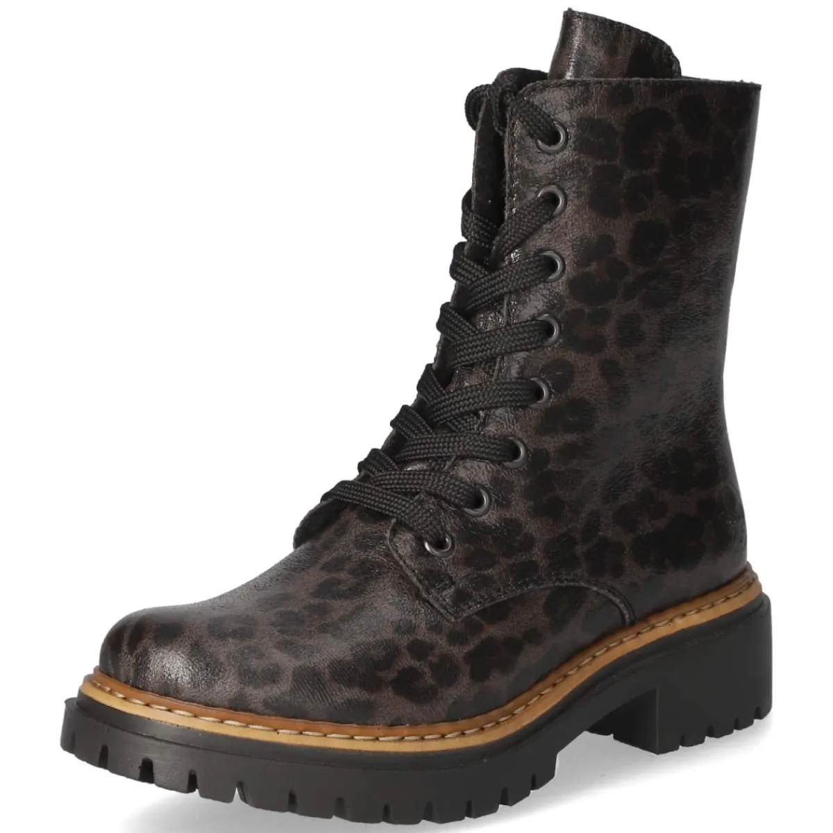 Rieker interpretiert Schnürstiefeletten für Damen mit einer markanten Mischung aus Komfort und Statement. Der braune Leopardenprint mit schimmernder Oberfläche setzt ein modisches Ausrufezeichen, während die runde Spitze und der 4 cm hohe Blockabsatz alltagstauglich bleiben. Robuste Synthetik oben und eine Synthetik-Decksohle bieten pflegeleichte Eigenschaften, das leichte Futter wärmt zuverlässig an kühlen Tagen. Dank Schnürsenkeln und zusätzlichem Reißverschluss entsteht ein praktischer Doppelverschluss, der schnellen Einstieg und individuellen Halt vereint. Die flexible, rutschhemmende Profilsohle sorgt für Grip auf herbstlichen Wegen, Markendetails runden den Look ab. Der Größenhinweis fällt normal aus und erleichtert die Wahl. Modetipp: Besonders wirkungsvoll zu dunkelblauer Skinny-Jeans und cremefarbenem Oversize-Strick, dazu eine Crossbody-Bag in Cognac für ein harmonisches Finish.