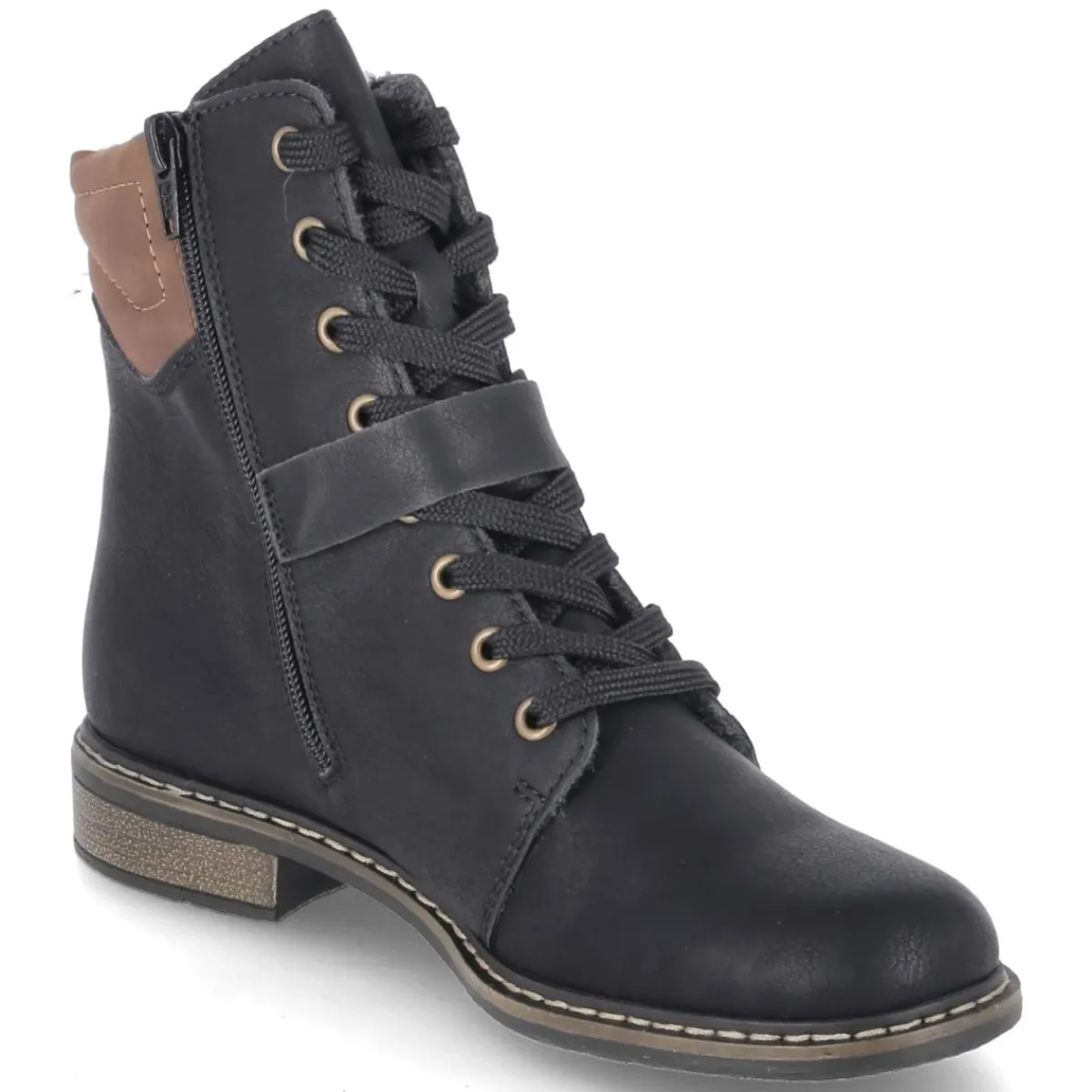 Diese Damen-Schnürstiefeletten von Rieker verbinden urbane Lässigkeit mit spürbarem Komfort. Das schwarze Synthetik-Obermaterial präsentiert eine pflegeleichte Oberfläche, während die runde Spitze und der 3 cm hohe Blockabsatz für eine zeitlose, bequeme Silhouette sorgen. Schnürsenkel und seitlicher Reißverschluss ermöglichen variablen Halt und ein schnelles An- und Ausziehen. Ein gepolsterter Einstieg in Braun setzt einen warmen Akzent, ergänzt durch einen Riemen mit Zierschnalle über dem Spann. Die weiche Decksohle aus Textil und das leichte Futter bieten Wohlgefühl an kühleren Tagen, das relaxt geringe Gewicht schont die Schritte im Alltag. Dank rutschfester Laufsohle ist zuverlässige Bodenhaftung gegeben. In der Passform fällt das Modell normal aus und eignet sich somit ideal für erwachsene Trägerinnen. Modetipp: Zu Strickkleid und Wollmantel entsteht ein cleaner City-Look, den ein gemusterter Schal harmonisch abrundet.