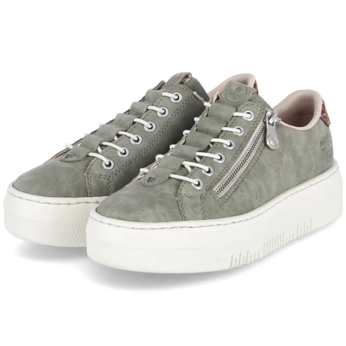 Der Slip-On-Sneaker von Rieker verbindet unkomplizierten Chic mit durchdachtem Komfort. Pflegeleichtes Kunstleder und die runde Schuhspitze sorgen für eine stilvolle, alltagstaugliche Optik, während der praktische Reißverschluss das Anziehen besonders leicht macht. Ein Elastikband in Schnüroptik gibt flexiblen Halt, die hautfreundliche Lederdecksohle und das weiche Fußbett verwöhnen bei jedem Schritt. Das geringe Gewicht entlastet auf langen Wegen, die 4 cm hohe Plateau-Sohle bietet angenehme Höhe und einen modernen Look. Ein besonderer Akzent ist die Fersenklappe mit Animal Print Leopard, die dem grünen Ton eine modische Note verleiht. Der Schuh fällt normal aus und begleitet zuverlässig durch Stadt und Freizeit. Modetipp: Zu Cropped-Jeans und weißem Hemd wirkt das Grün besonders frisch, ein beiger Trench rundet den Look souverän ab.