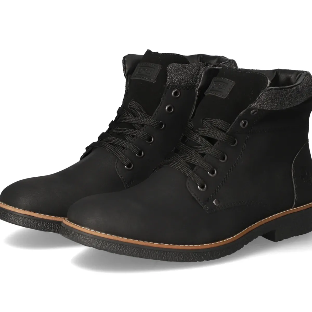 Der Winterboot von Rieker überzeugt als zuverlässiger Begleiter für kalte Tage. Pflegeleichtes Kunstleder mit markanten Ziernähten trifft auf ein wärmendes Futter, das den Fuß angenehm umschließt. Die Kombination aus Schnürung und praktischem Reißverschlusseinstieg sorgt für individuellen Halt und schnellen Einstieg. Ein 2,5 cm hoher Blockabsatz und die flexible, rutschhemmende Profilsohle bieten Stabilität auf nassem Pflaster und winterlichen Wegen. Die runde Schuhspitze schafft Bewegungsfreiheit, der textil gepolsterte Schaftkragen und der verstärkte Fersenbereich erhöhen den Komfort. Dank gepolsterter Wechseldecksohle und textiler Decksohle bleibt das Tragegefühl auch bei längeren Strecken entspannt. Das Modell fällt normal aus und punktet in klassischem Schwarz mit dezentem Markenlogo. Modetipp: Zu dunkler Denim, Strickpullover und Wollmantel kombinieren; so gelingt ein urbaner Winter-Look mit klarer Linie.