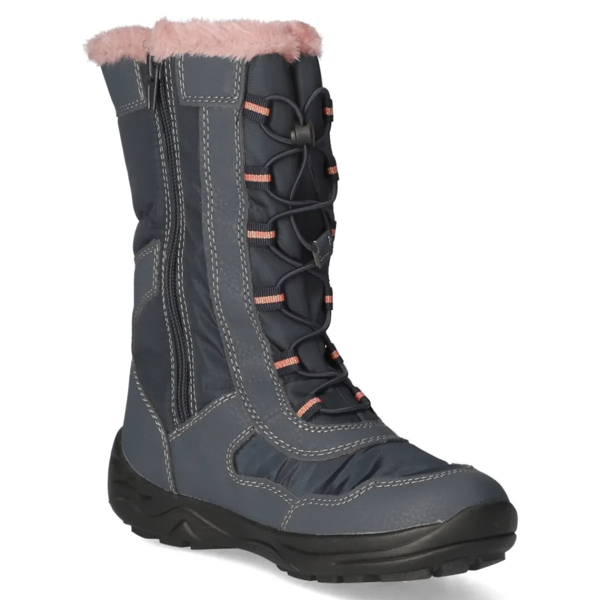 Winterstiefel CATHRIN von Lico begleitet aktive Kinder zuverlässig durch nasse und kalte Tage. Das blaue Obermaterial aus Textil und Synthetik wird von rosa Highlights, modischen Ziernähten und glitzernden Sternmotiven belebt, der textile Schaftkragen liegt weich an. Warmfutter und isolierende Ausstattung halten die Füße angenehm temperiert, Comfortex unterstützt die wasserfeste, wasserabweisende Wirkung. Der runde Leisten bietet Zehenfreiheit, der verstärkte Fußrahmen sorgt für Stabilität. Ein bequemer Einstieg gelingt über Schnellverschluss und Reißverschluss, das Wechselfußbett aus Textil lässt sich zum Lüften oder für eigene Einlagen entnehmen. Die flexible, rutschhemmende Profilsohle gibt Halt auf winterlichem Untergrund, die Passform fällt normal aus und eignet sich für die Zielgruppe Kind. Modetipp: Mit Thermohose, Strickmütze in Rosa und einer blauen Steppjacke entsteht ein stimmiger, fröhlicher Winterlook.