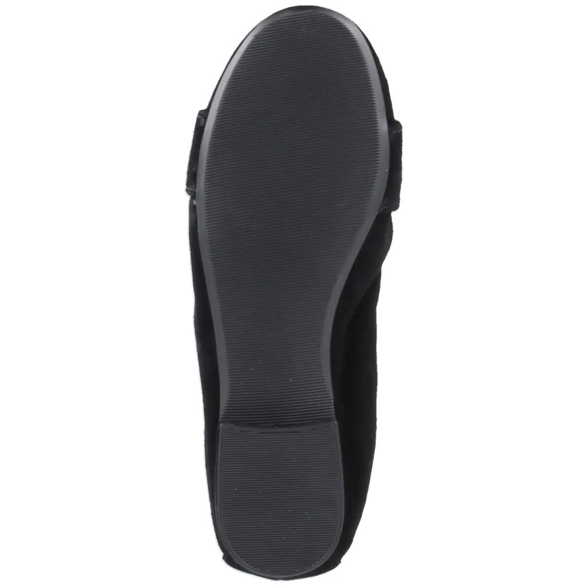 Der Ballerina von Kaerlek in klassischem Schwarz verbindet feminine Linien mit wohldurchdachten Komfortdetails. Weiches Rauleder und langlebiges Echtleder treffen auf eine gepolsterte Decksohle aus Leder, die den Fuß angenehm unterstützt. Der elastische Einstieg umschließt sanft den Spann und erleichtert das Hineinschlüpfen, während der kleine Zierriemen mit Metallelement in Titanoptik und die angedeutete Zunge dem puristischen Design eine edle Note geben. Die runde Schuhspitze wirkt zeitlos, die verstärkte Ferse sorgt für Formstabilität. Mit 2 cm hohem Blockabsatz und sehr flexibler, rutschhemmender Laufsohle bietet das Modell zuverlässigen Halt im Alltag. Fällt normal aus und kommt ganz ohne Verschluss aus – ideal für schnelle Looks zwischen Büro und Freizeit. Modetipp: Zu knöchellangen Zigarettenhosen und einem strukturierten Blazer entsteht ein moderner, reduzierter City-Chic, der die subtile Metall-Details elegant aufgreift.