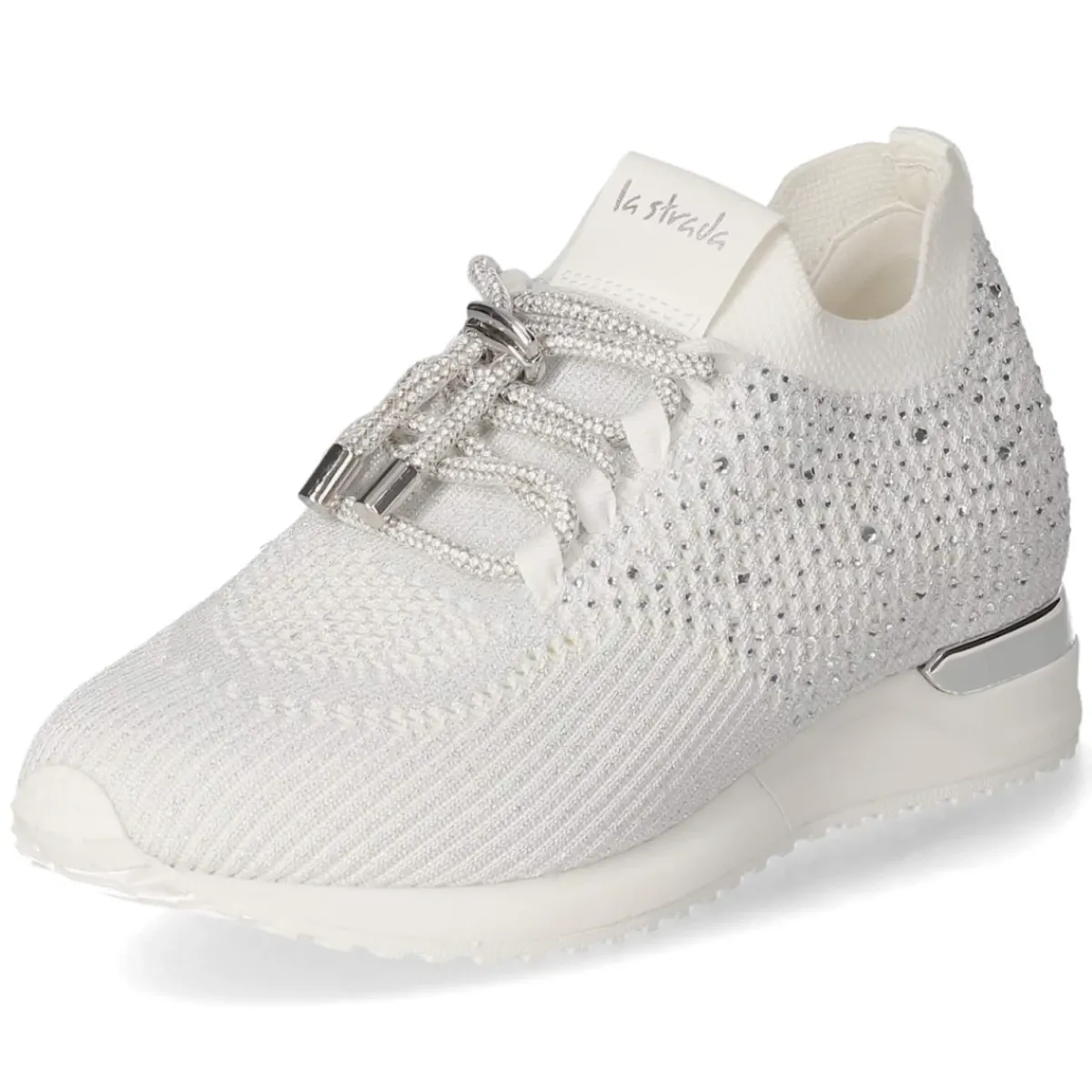 Der Low Sneaker von La Strada zeigt sich in strahlendem Weiß mit eleganter Ausstrahlung und fein dosiertem Funken: silberfarbene Glitzerakzente und dezent gefasste Schmucksteine setzen edle Highlights. Das leichte Textilobermaterial umschließt den Fuß angenehm, der elastische Einstieg erleichtert das Hineinschlüpfen, während die Kombination aus Schnürung und praktischem Schnellverschluss eine individuelle Anpassung ermöglicht. Ein rund zulaufender Leisten sorgt für zeitlose Linien, die gepolsterte Wechseldecksohle aus Textil und das komfortable Wechselfußbett verwöhnen bei jedem Schritt. Der verstärkte Fersenbereich gibt Halt, die flexible, rutschhemmende Laufsohle unterstützt einen sicheren Auftritt. Mit normal ausfallender Passform und feinen Markendetails ein vielseitiger Begleiter vom Büro bis zum Dinner. Modetipp: zu cropped Jeans, Seidenbluse und einem minimalistischen Trench kombinieren.